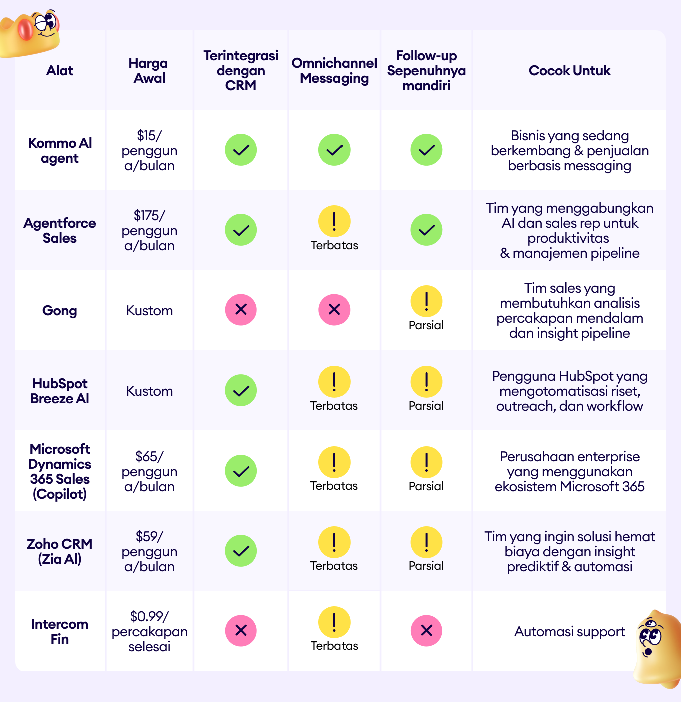 Tabel ini membandingkan agen penjualan AI utama, harga, dan kemampuannya. Agen AI Kommo menonjol sebagai solusi yang terintegrasi langsung dengan CRM, omnichannel, dan sepenuhnya mandiri, sehingga ideal untuk tim yang ingin dengan mudah mengubah percakapan menjadi penjualan.