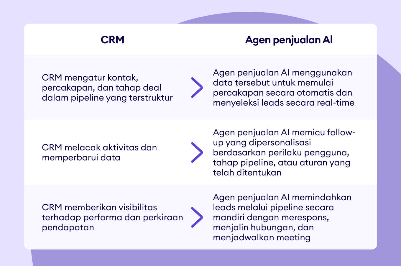 CRM adalah fondasi dari operasional penjualan kamu. CRM menyimpan data kontak, melacak tahap deal, dan memusatkan visibilitas pipeline. Agen penjualan AI dibangun di atas fondasi tersebut dengan memanfaatkan data di CRM kamu untuk mengotomatisasi tindakan secara real-time.