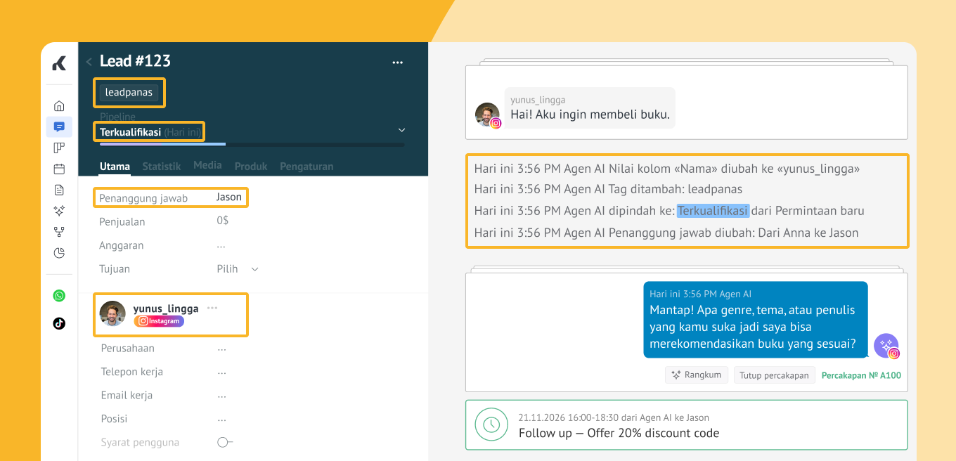 Ketika keduanya bekerja bersama di dalam platform yang sama, percakapan, automasi, dan manajemen pipeline tetap sepenuhnya selaras. Di sinilah automasi penjualan berbasis AI menjadi benar-benar scalable dan efektif.