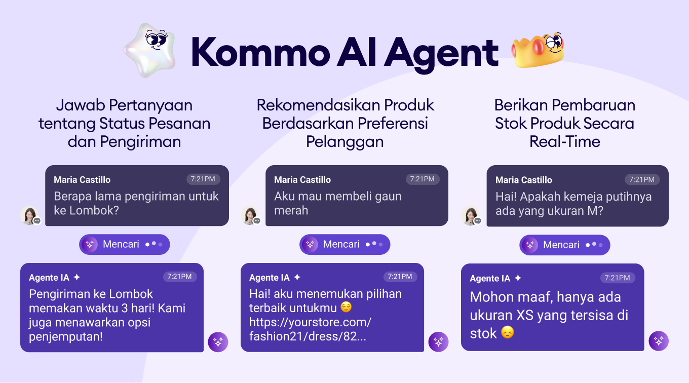 Dengan agen AI tanpa kode dari Kommo, kamu bisa mengautomasi komunikasi, melakukan kualifikasi leads, menjadwalkan meeting, dan bahkan mempersonalisasi percakapan e-commerce — semuanya dari satu tempat.
