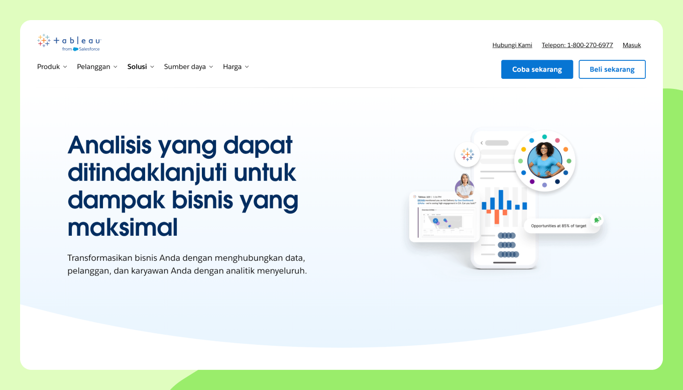 Dengan mengintegrasikan Salesforce, platform cloud, dan database on-premise, Tableau menyediakan tampilan kinerja bisnis yang terpadu, memungkinkan strategi berbasis data di seluruh organisasi.