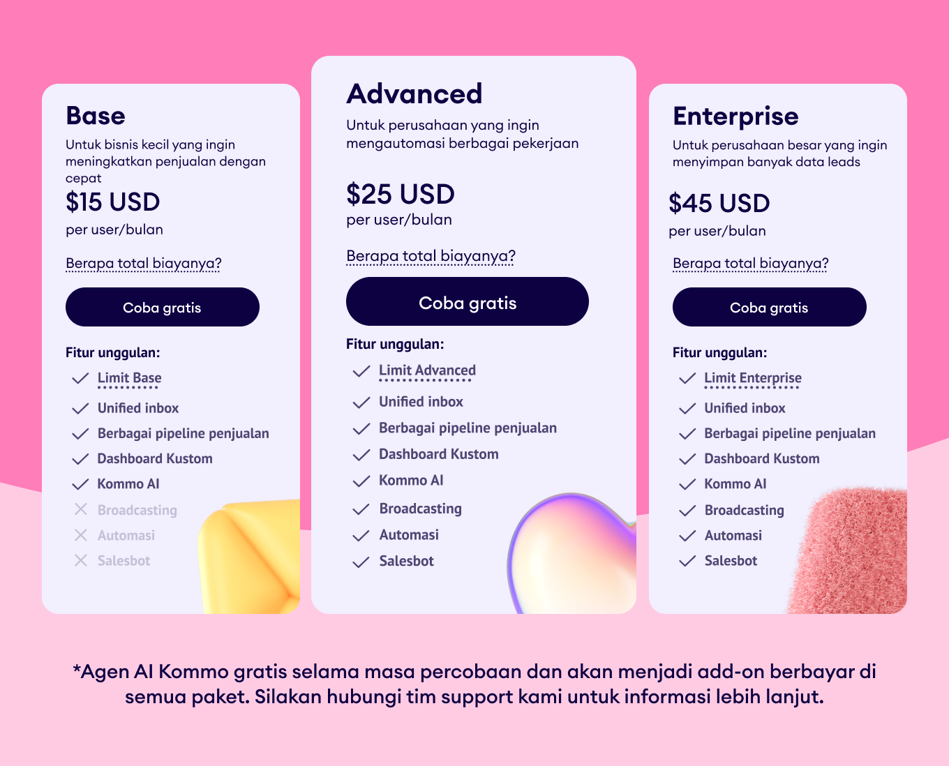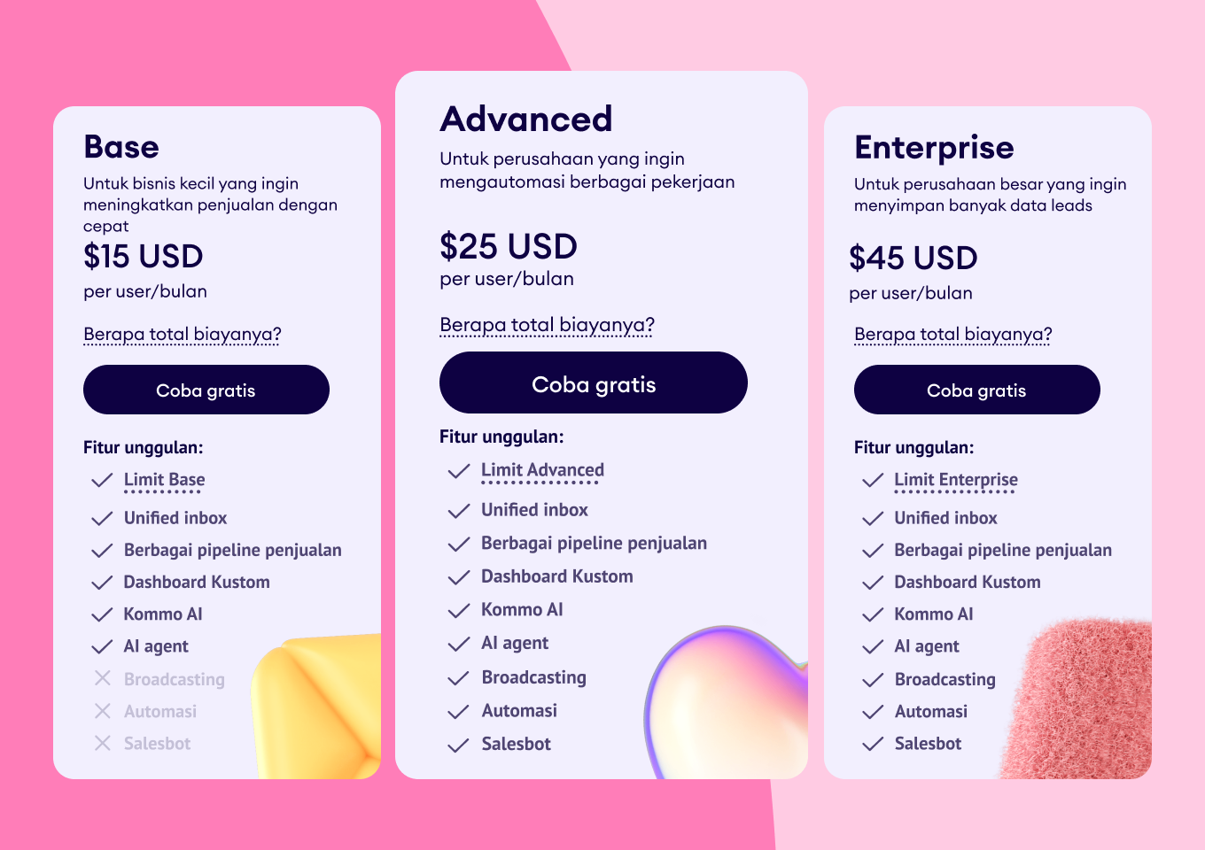 Harga Kommo dibagi menjadi tiga paket: paket Base berharga sekitar $15 per user/bulan, paket Advanced $25, dan paket Enterprise $45 — setiap tingkat membuka lebih banyak otomatisasi, fitur lanjutan, serta batas yang lebih tinggi untuk kontak dan custom fields.