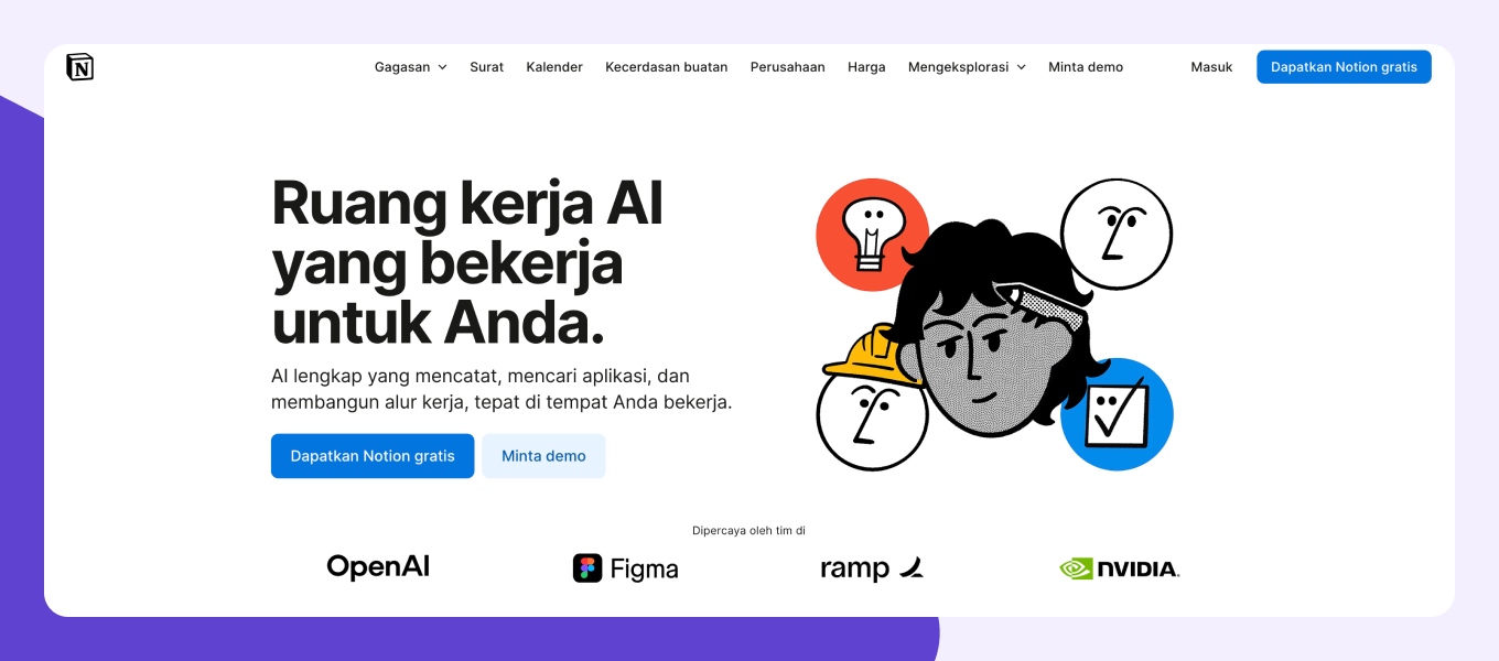 Paket Notion yang mencakup agen AI adalah paket Business yang dimulai dari $20/pengguna/bulan. Integrasi yang mulus ini menjadikannya alat yang kuat untuk mempercepat pekerjaan tanpa meninggalkan workspace kamu.