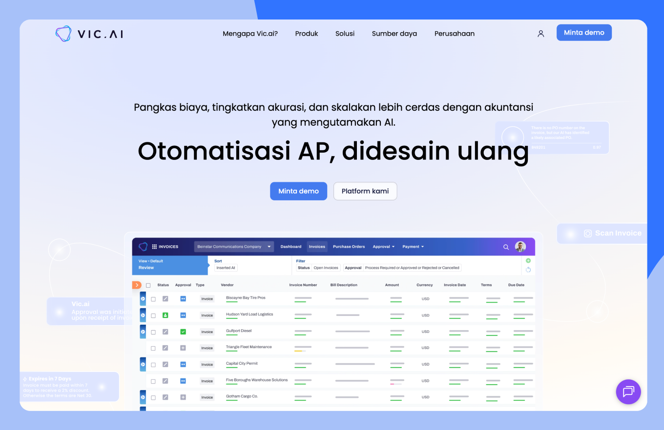 Vic.ai adalah platform AI-native yang dibangun untuk mengotomatisasi alur kerja akuntansi. Platform ini terintegrasi langsung dengan sistem ERP dan AP-mu, serta dapat mengekstraksi konteks dari transaksi historis, pola vendor, dan aturan persetujuan untuk memberikan rekomendasi yang terasa sesuai dengan kebutuhan organisasi kamu.