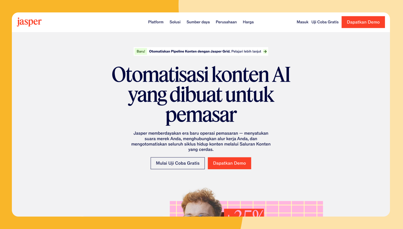 Jasper adalah platform pembuatan konten bertenaga AI yang membantu tim marketing dan kreatif menghasilkan, mengoptimalkan, dan melakukan scale konten tulisan maupun visual di berbagai channel. Dengan terhubung ke brand guidelines, sumber pengetahuan, dan konten pipeline kamu, Jasper memastikan output tetap konsisten, on-brand, dan relevan untuk audiens kamu.