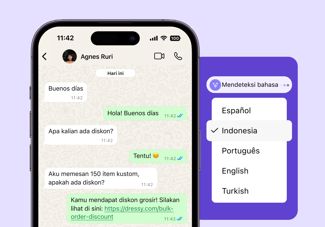 Dukungan multi-bahasa: Mendeteksi dan membalas menggunakan bahasa yang digunakan pelanggan, dengan jawaban yang natural dan kontekstual.