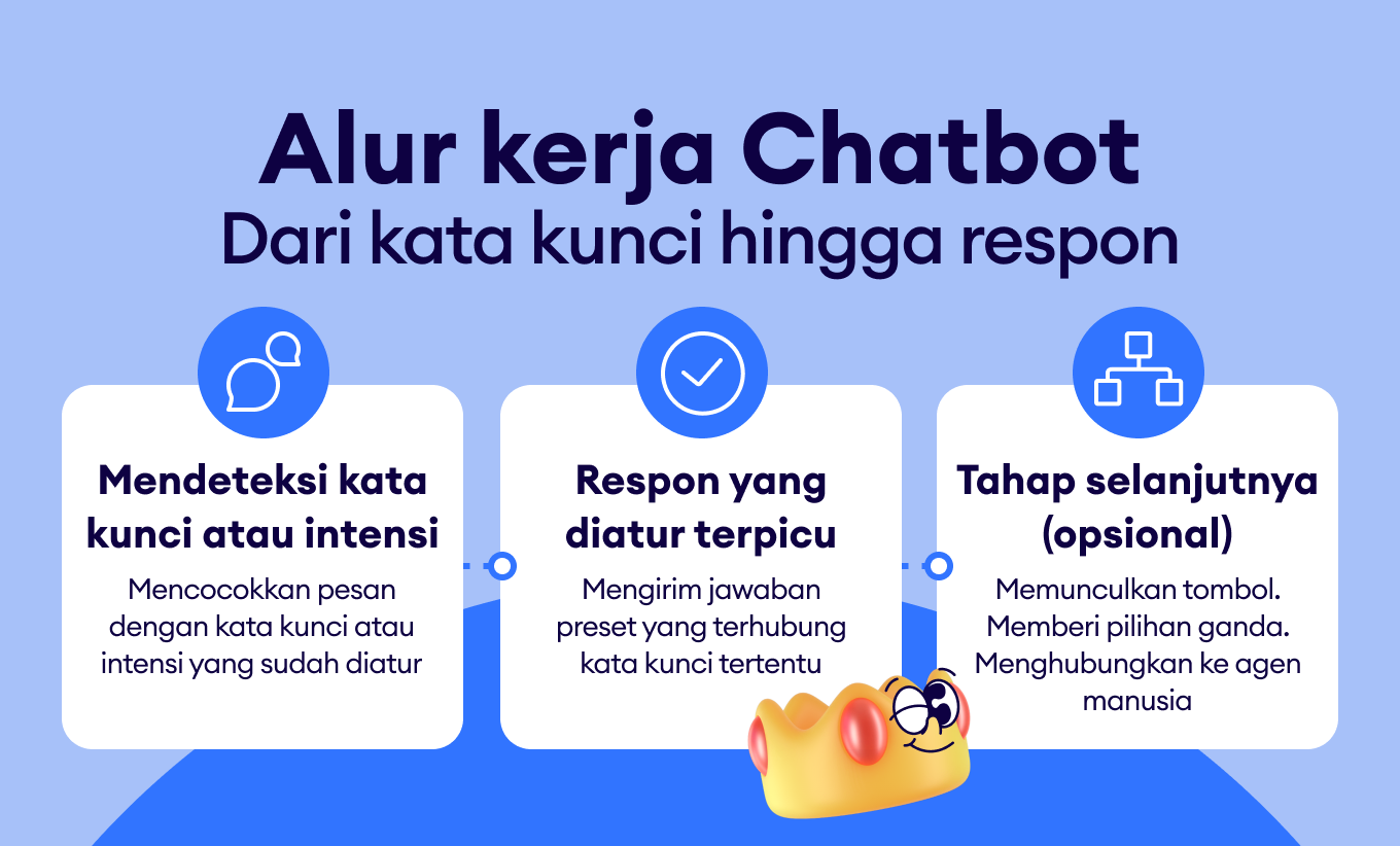 Deteksi keyword atau intent: Chatbot mencocokkan pesan dengan kata kunci atau intensi yang sudah ditentukan sebelumnya.