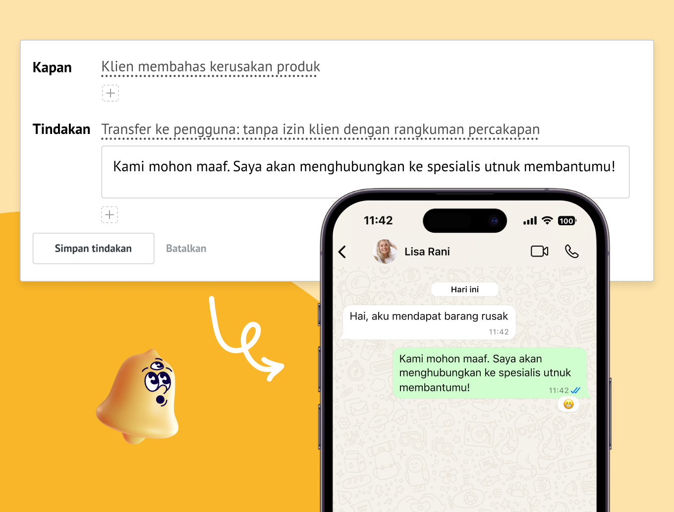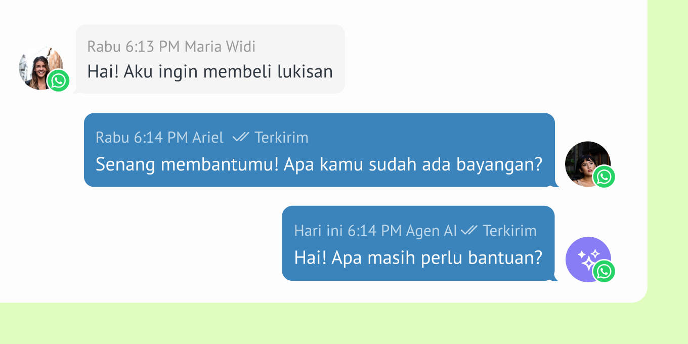 Mengambil tindakan: Agen membalas pesan, mengajukan pertanyaan lanjutan, memicu automation, atau memperbarui data di CRM.