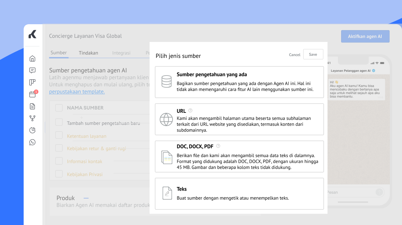 Sumber (Sources): Upload file, tempel teks, atau import URL agar agen AI kamu selalu memiliki informasi produk, kebijakan, atau FAQ yang terbaru.