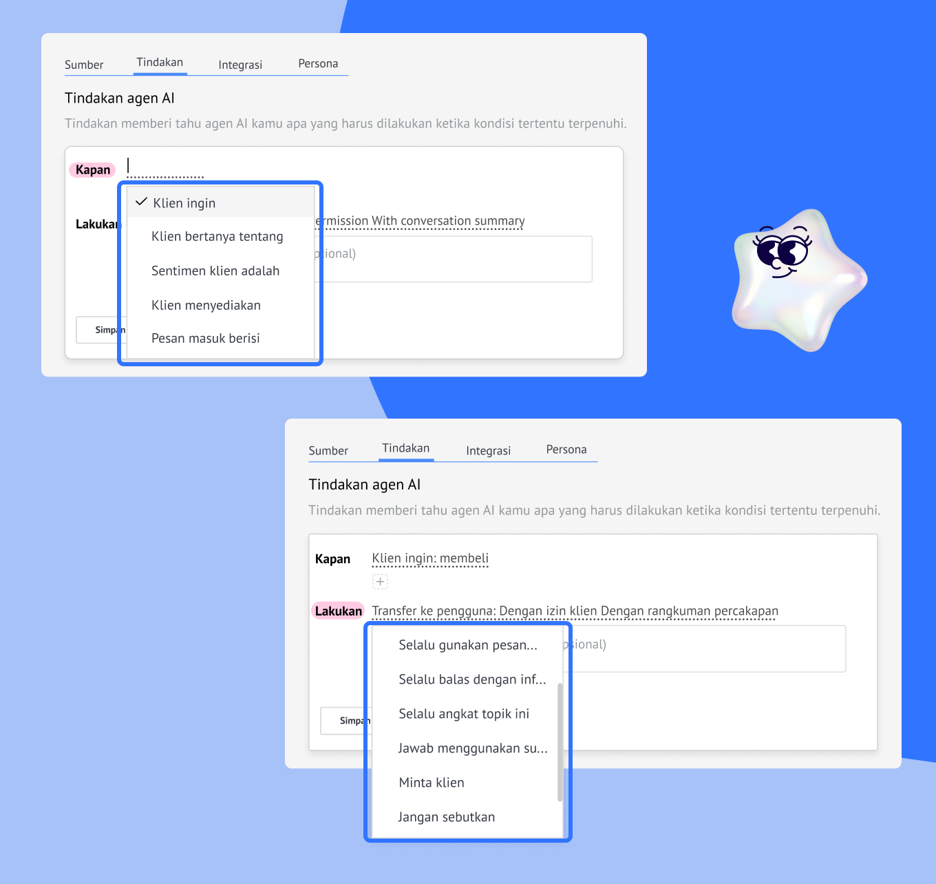 Tindakan (Actions): Gunakan logika sederhana Ketika → Lakukan untuk menentukan bagaimana agen AI merespons, seperti membalas permintaan refund atau memberi tag untuk leads yang memenuhi syarat.