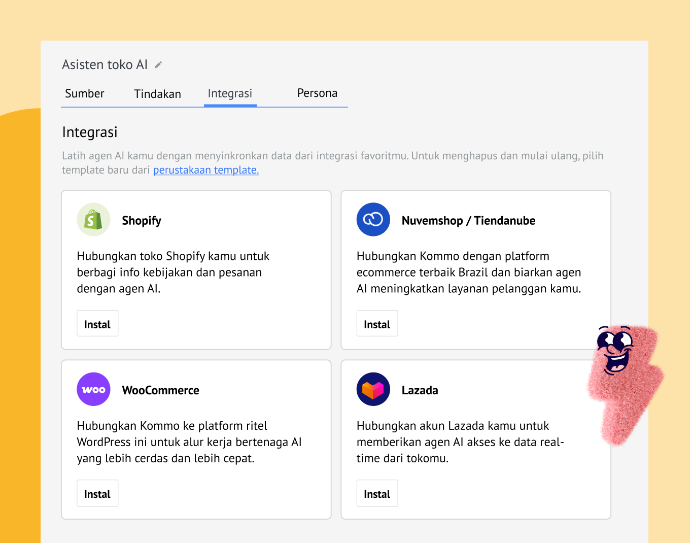 Integrasi (Integrations): Hubungkan toko e-commerce seperti Shopify, WooCommerce, Lazada, atau Nuvemshop agar agen AI dapat mengakses data pesanan, produk, dan stok secara langsung.