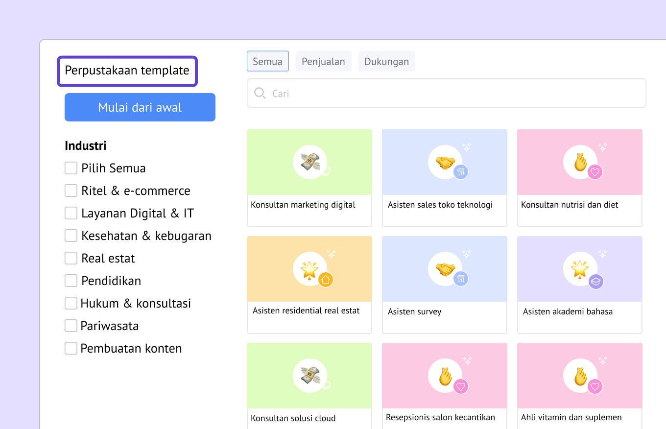 Pilih template agen AI yang paling sesuai untuk industri atau peran kamu.