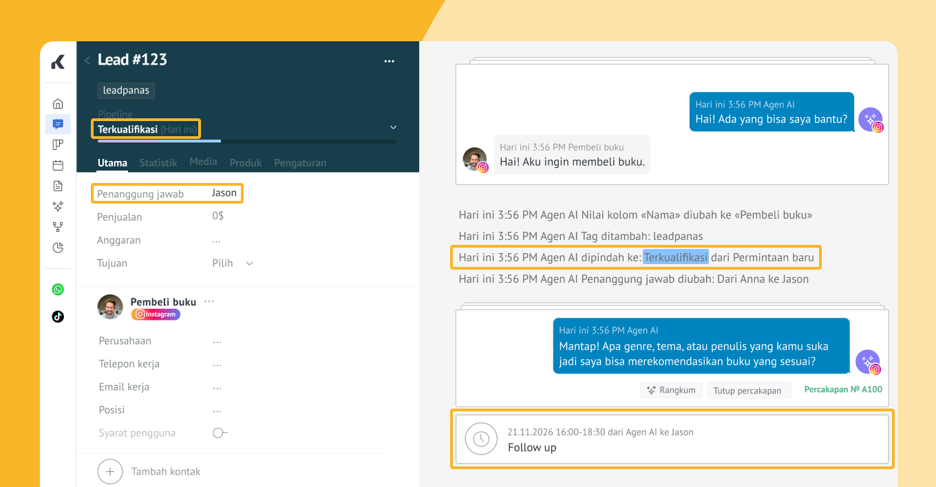 Agen AI tanpa kode dari Kommo memungkinkan kamu mengotomatisasi percakapan pelanggan, mengkualifikasi leads, menjadwalkan meeting, bahkan mempersonalisasi interaksi e-commerce — semuanya tanpa perlu berpindah aplikasi.