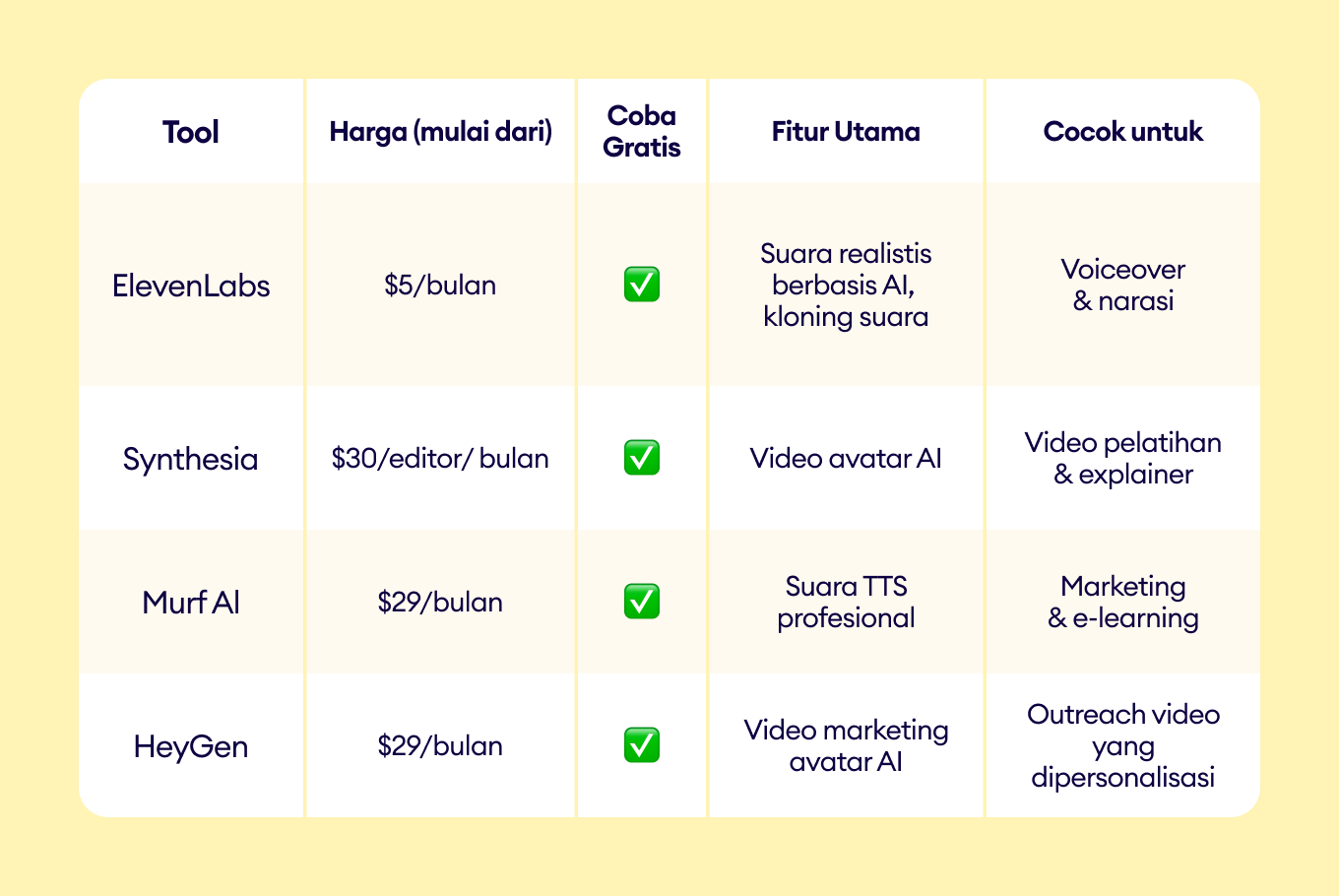 Tabel perbandingan: AI tools untuk voice, audio & avatars