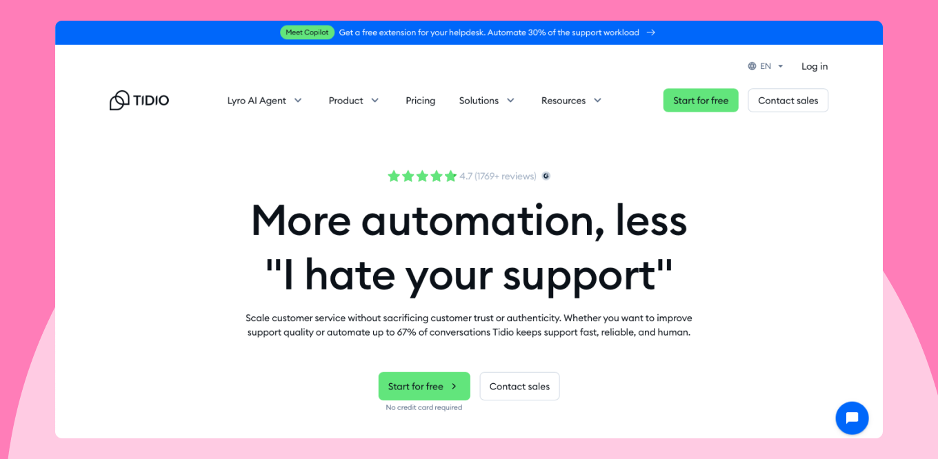 Tidio AI adalah solusi AI ringan yang dirancang untuk bisnis kecil dan menengah yang mencari automasi cepat dan sederhana.