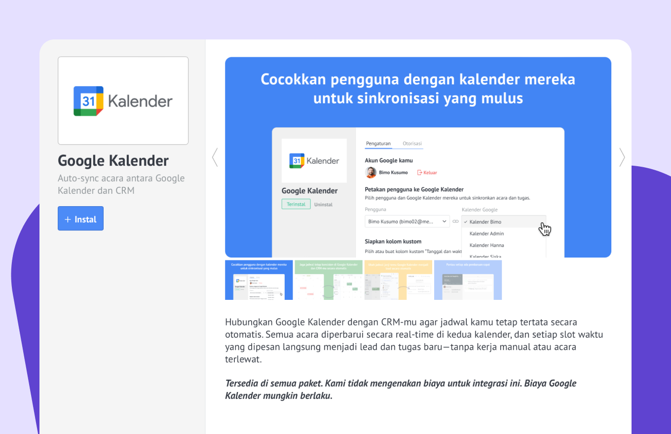 Buka Pengaturan > Marketplace integrasi > cari Google Kalender > klik click Instal.