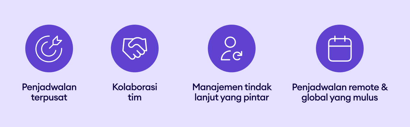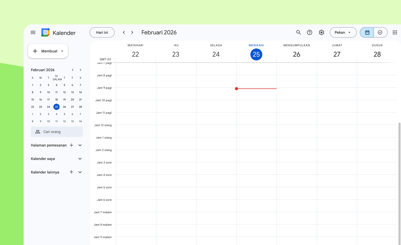 Kolaborasi tim: Dengan Google Kalender, kamu bisa menghilangkan bolak-balik komunikasi yang tidak perlu soal ketersediaan dengan melihat slot waktu kosong secara real-time, sehingga penjadwalan jadi lebih cepat dan efisien.