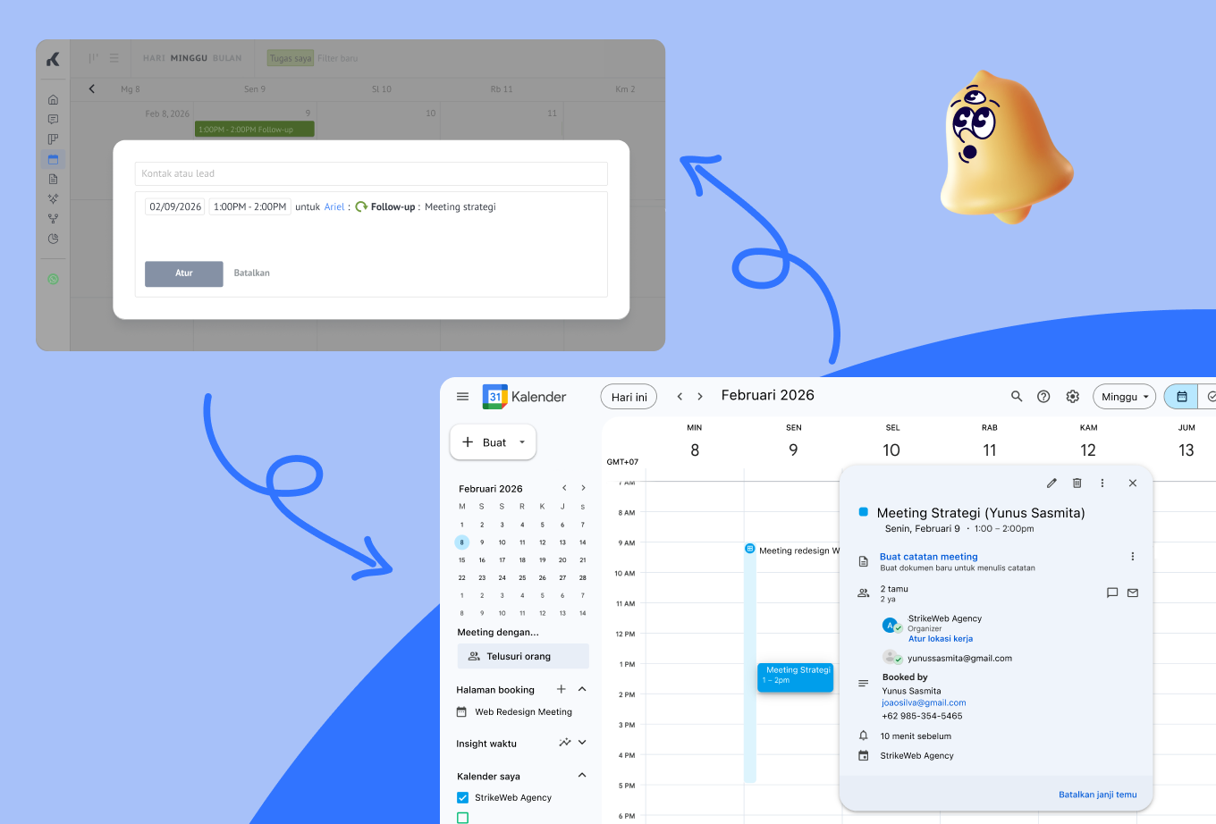 Integrasi baru ini menghilangkan double-entry manual dan perpindahan aplikasi dengan menghadirkan sinkronisasi dua arah secara instan untuk semua tugas dan meeting kamu. Baik kamu membuat, mengedit, maupun memindahkan acara, kedua platform akan diperbarui secara real-time, dengan perubahan yang langsung terlihat di kartu lead untuk memastikan jadwal kamu selalu akurat dan terorganisir.