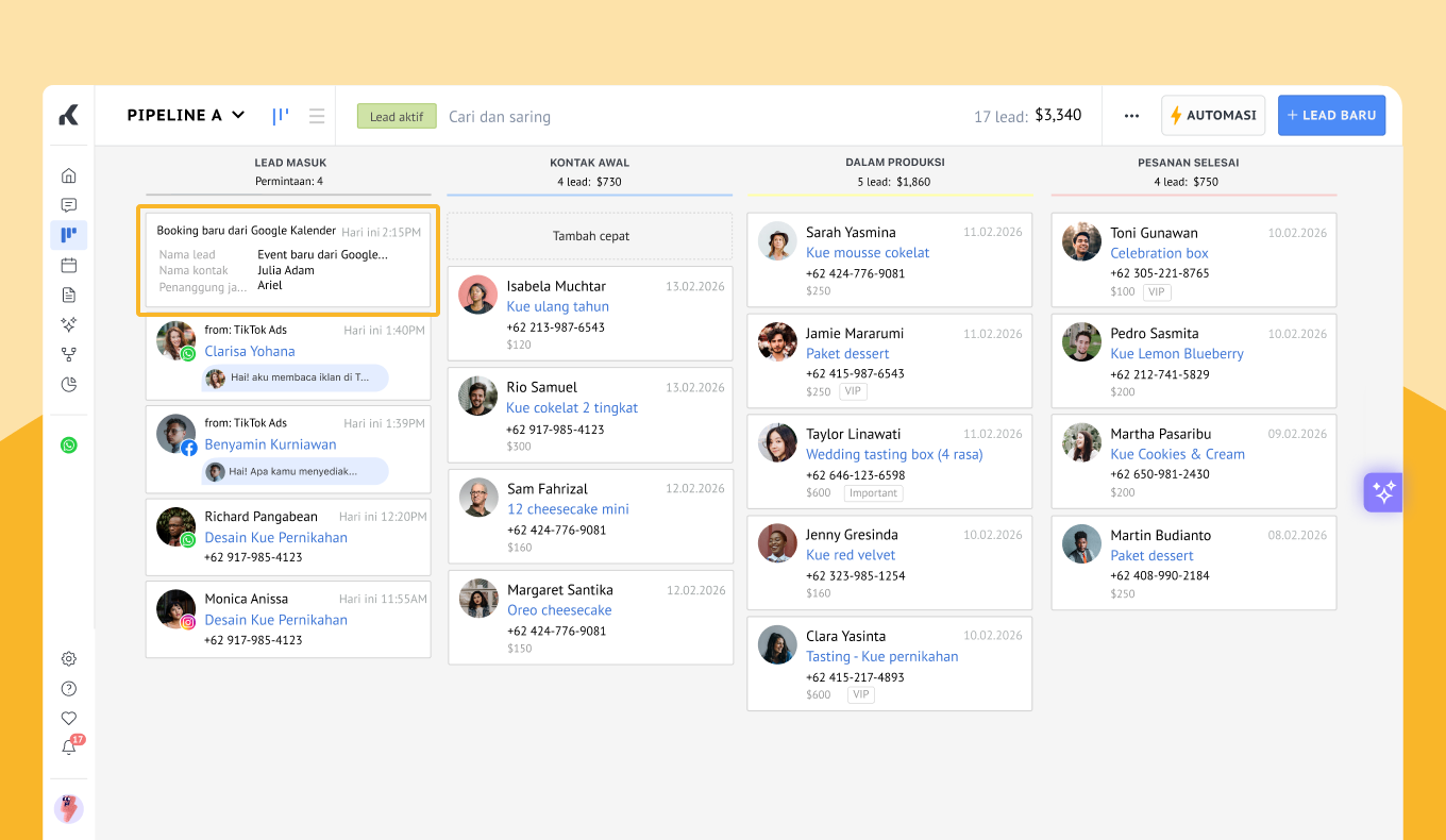 Setiap booking baru menjadi kartu lead di pipeline Kommo