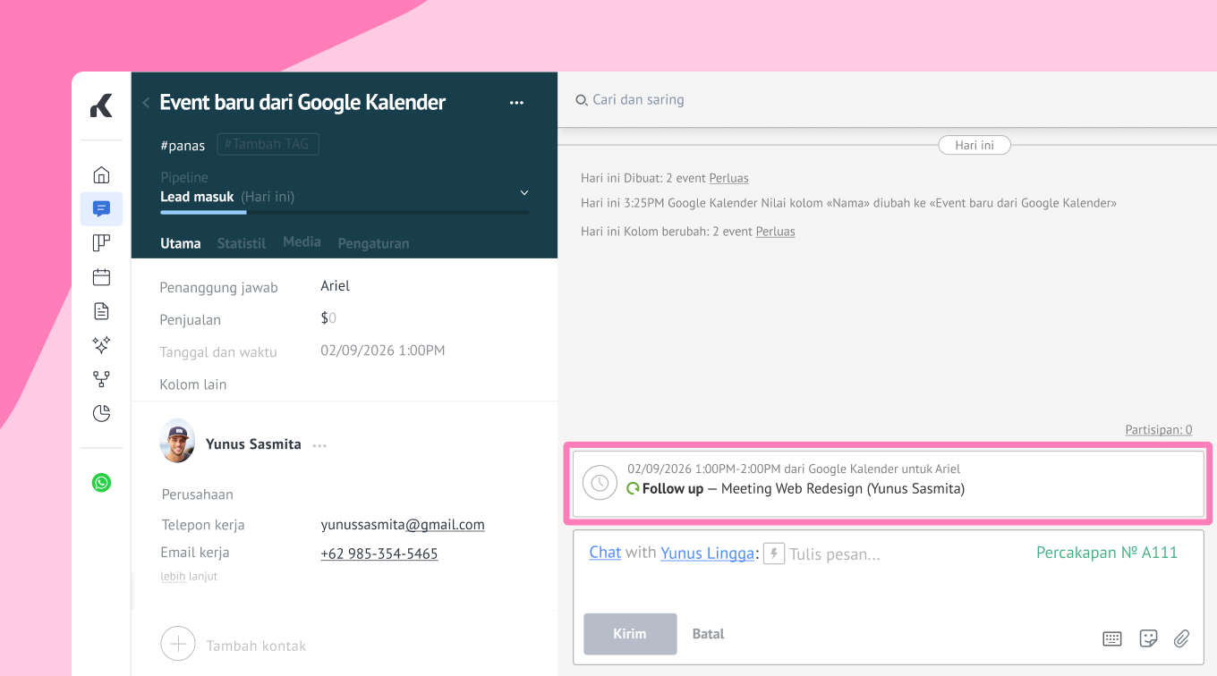 Karena sinkronisasi berlangsung secara real-time, kamu bisa menjadwalkan ulang meeting dari aplikasi Google Kalender di ponsel dan langsung melihat perubahannya di pipeline CRM kamu beserta pengingat follow-up.