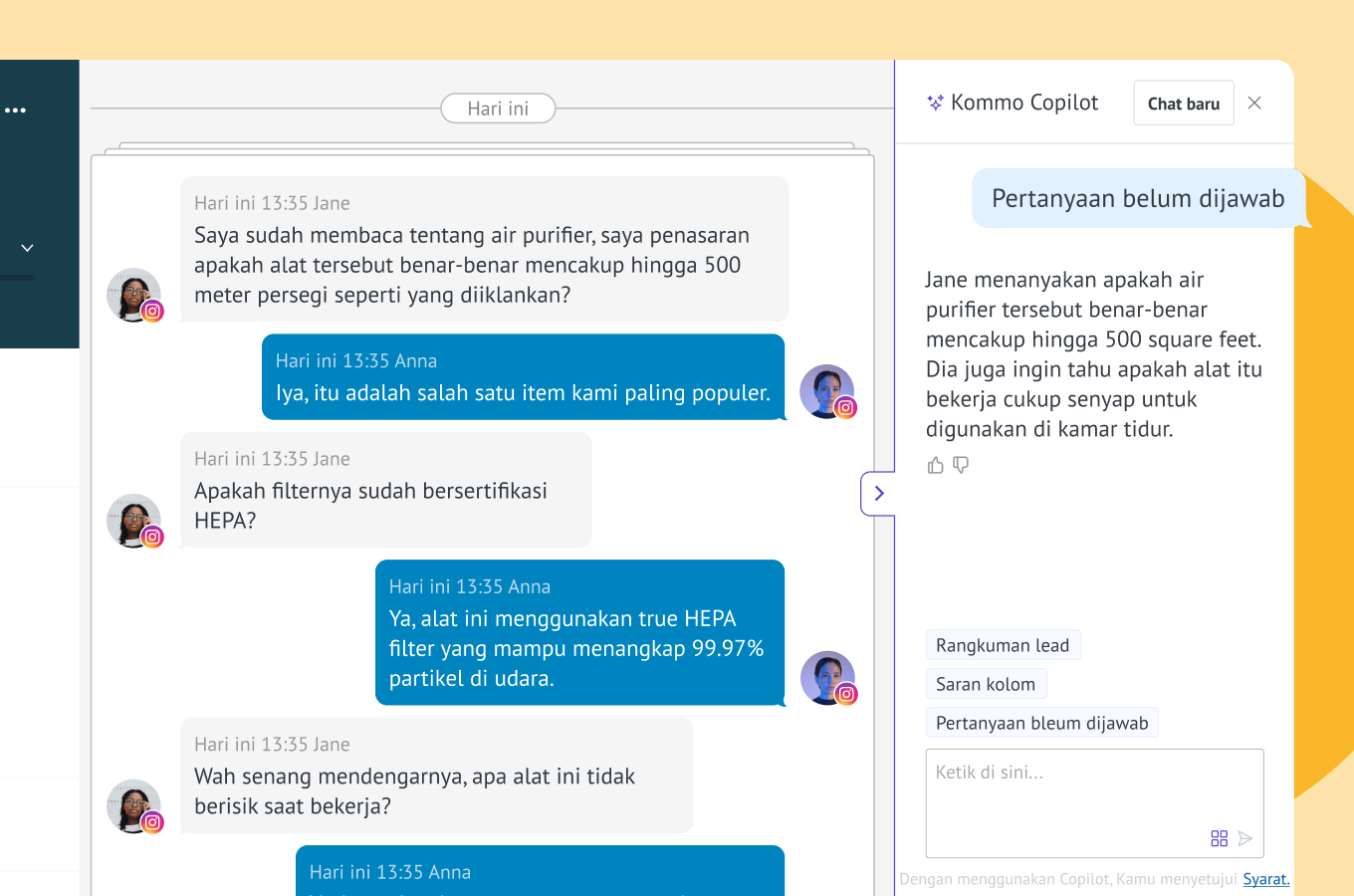Kommo AI adalah lapisan kecerdasan yang meningkatkan setiap interaksi pelanggan secara real time. Ia berfungsi sebagai asisten pintar untuk tim kamu, menganalisis percakapan saat terjadi untuk memberikan dukungan dan insight instan, sehingga tidak ada pesan yang salah ditangani.