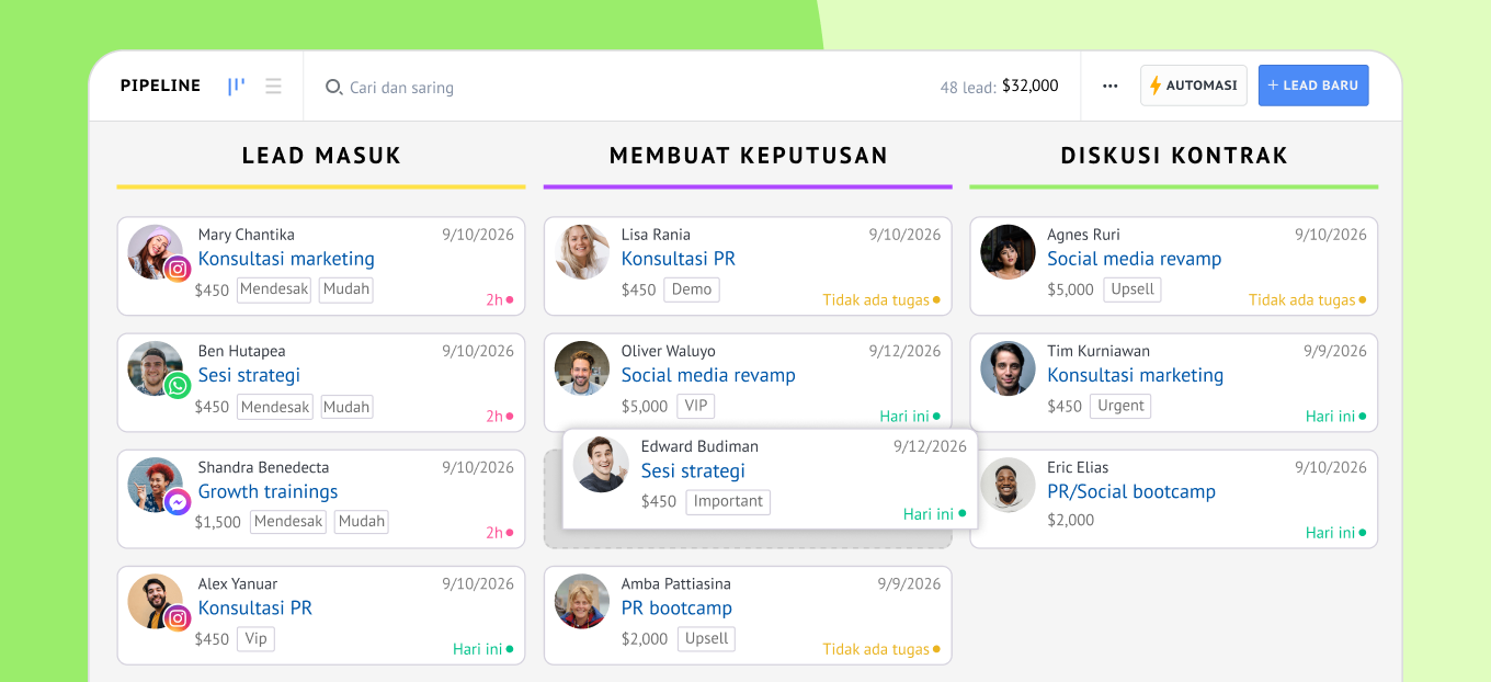 Pipeline penjualan visual: Secara otomatis mengatur kontak ke dalam papan (board) yang jelas dan bisa dimodifikasi, sehingga kamu selalu tahu status setiap lead.