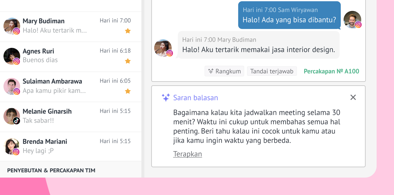 Kotak masuk terpadu: Menggabungkan semua interaksi Instagram seperti DM, komentar, dan balasan Story, bersama percakapan dari channel lain ke dalam satu dasbor.