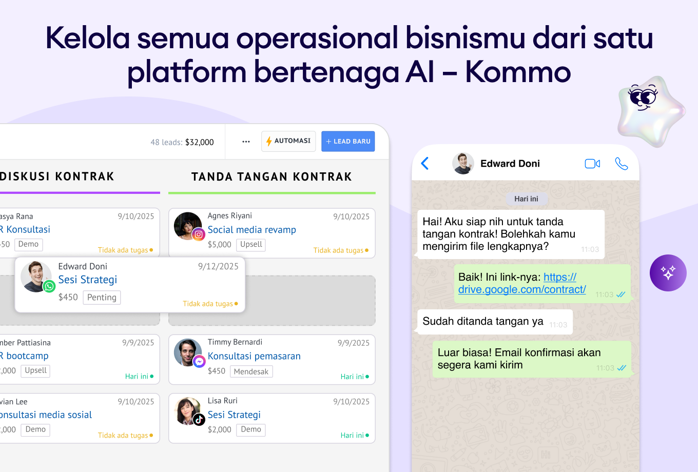 Kommo adalah conversational CRM bertenaga AI yang dirancang untuk bisnis modern yang ingin terhubung lebih cerdas dan menjual lebih cepat. Kommo menggabungkan semua saluran komunikasi, pipeline penjualan, dan otomatisasi kamu dalam satu platform terpadu - jadi kamu bisa mengelola leads, membangun relasi, dan menutup lebih banyak penjualan dengan usaha yang lebih sedikit.