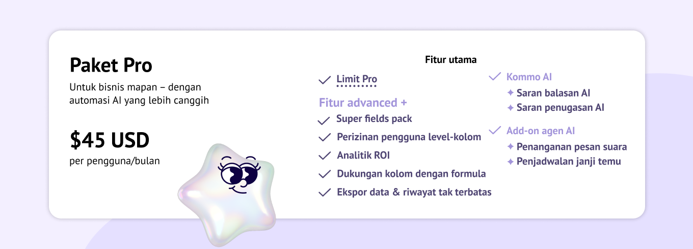 Paket Pro dirancang untuk tim besar yang membutuhkan automasi tingkat lanjut, insight yang lebih mendalam, dan skalabilitas maksimal. Paket ini mencakup limit lebih tinggi: 50.000 kontak, 10.000 leads aktif, 400 kolom kustom, dan 400MB penyimpanan file.