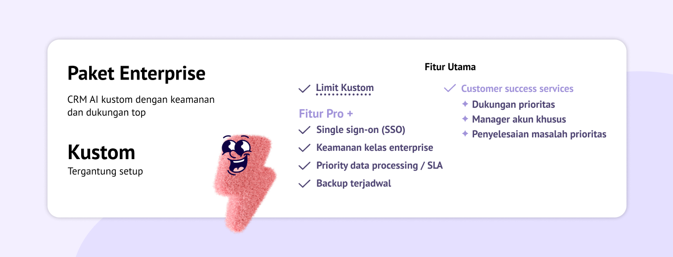 Paket Enterprise dirancang untuk organisasi dengan kebutuhan yang kompleks dan memerlukan setup khusus, keamanan tingkat enterprise, serta layanan prioritas. Paket ini mencakup semua fitur di paket Pro, ditambah single sign-on (SSO), keamanan yang ditingkatkan, pemrosesan data prioritas dengan SLA, serta backup terjadwal.