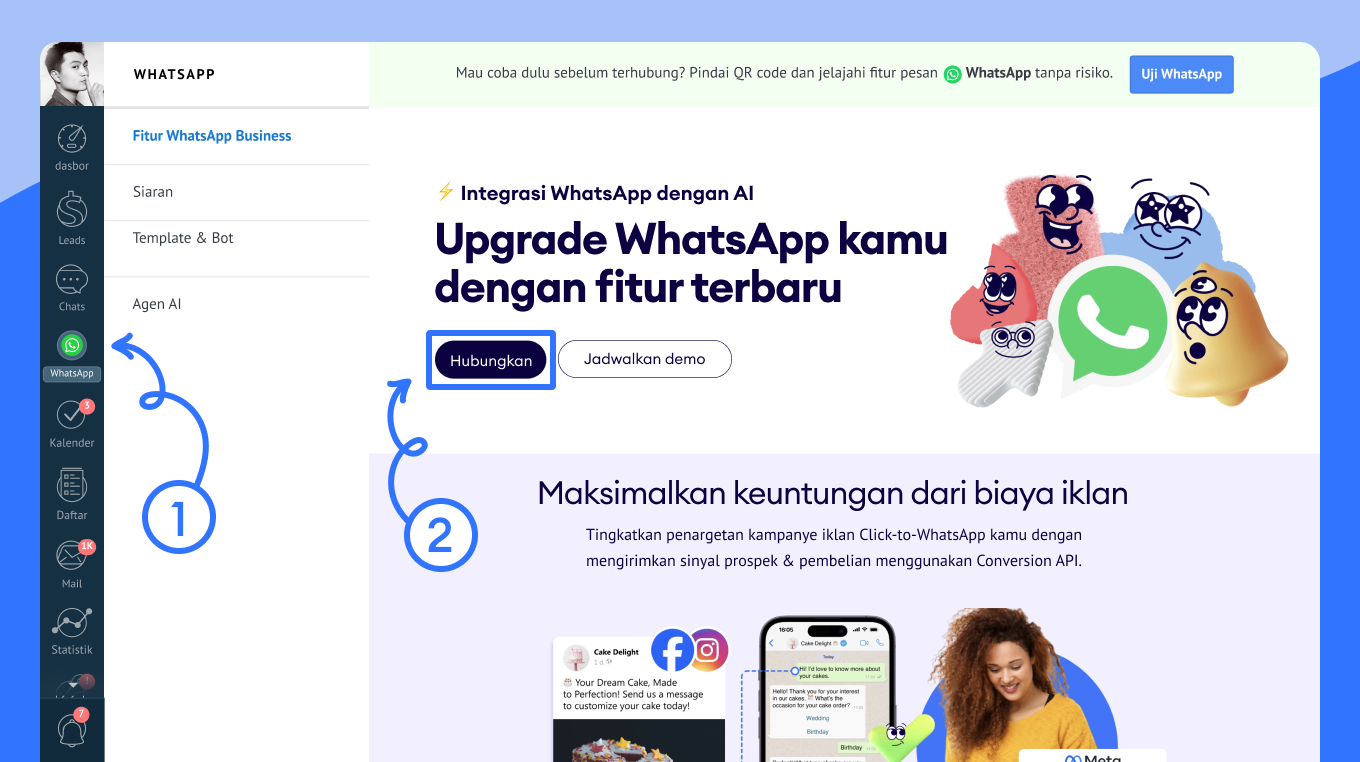 1. Masuk ke menu WhatsApp di bilah menu sebelah kiri > klik Hubungkan.
