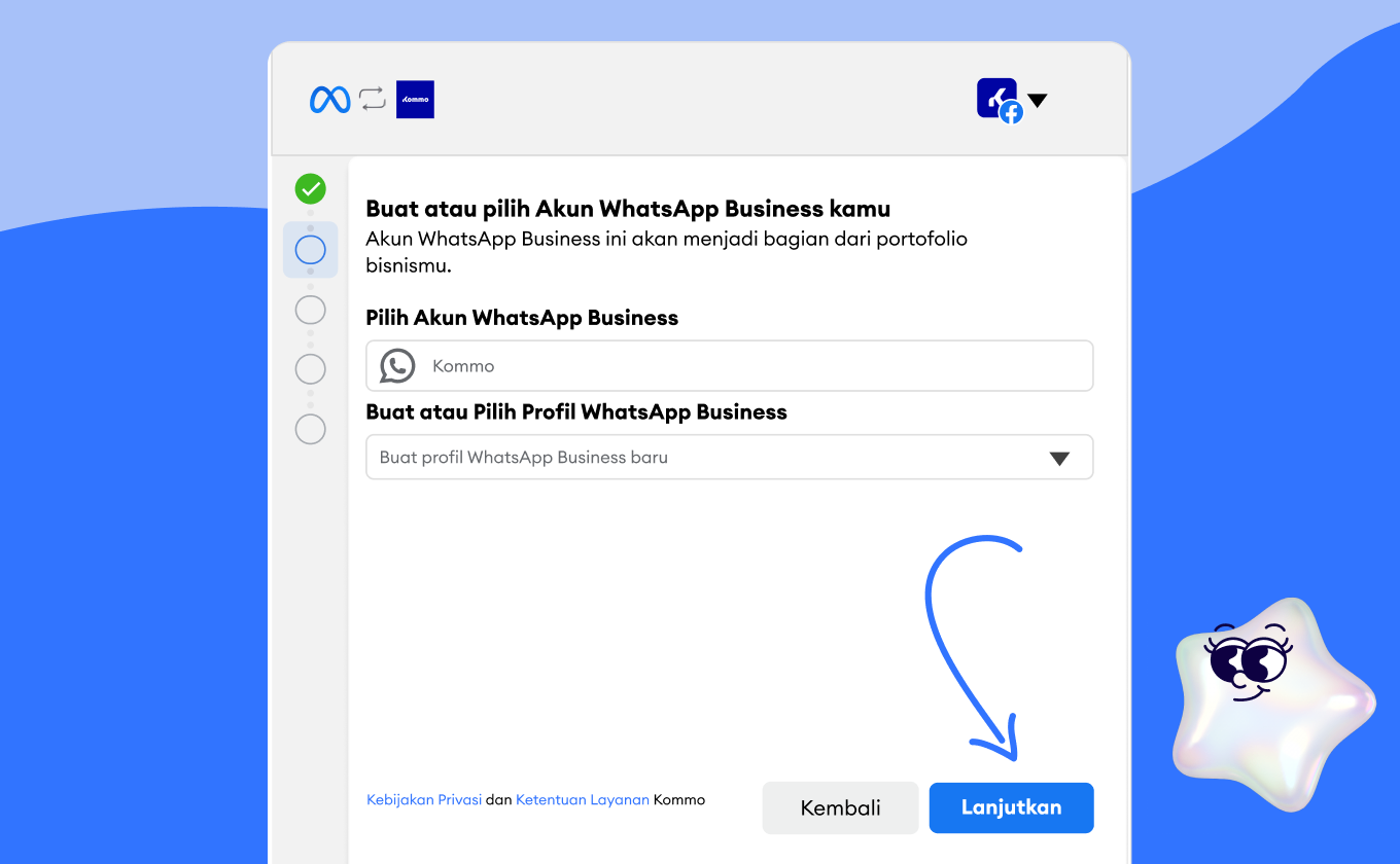 2. Pilih akun WhatsApp Business, lalu pilih Buat Portofolio WhatsApp Business Baru dan klik Berikutnya.