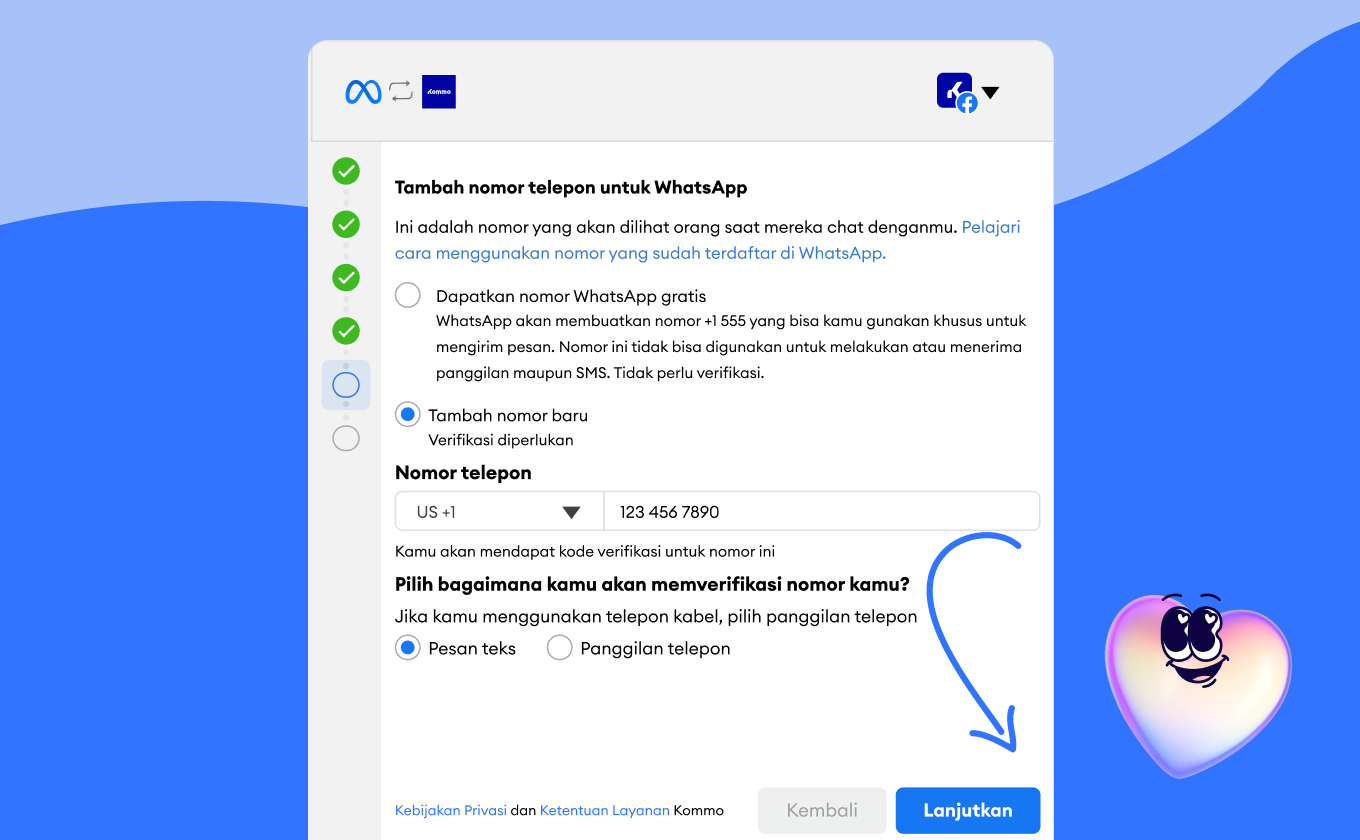1. Pilih Tambah nomor baru, masukkan nomor telepon kamu, lalu pilih metode verifikasi (pesan teks atau panggilan telepon). Klik Berikutnya.