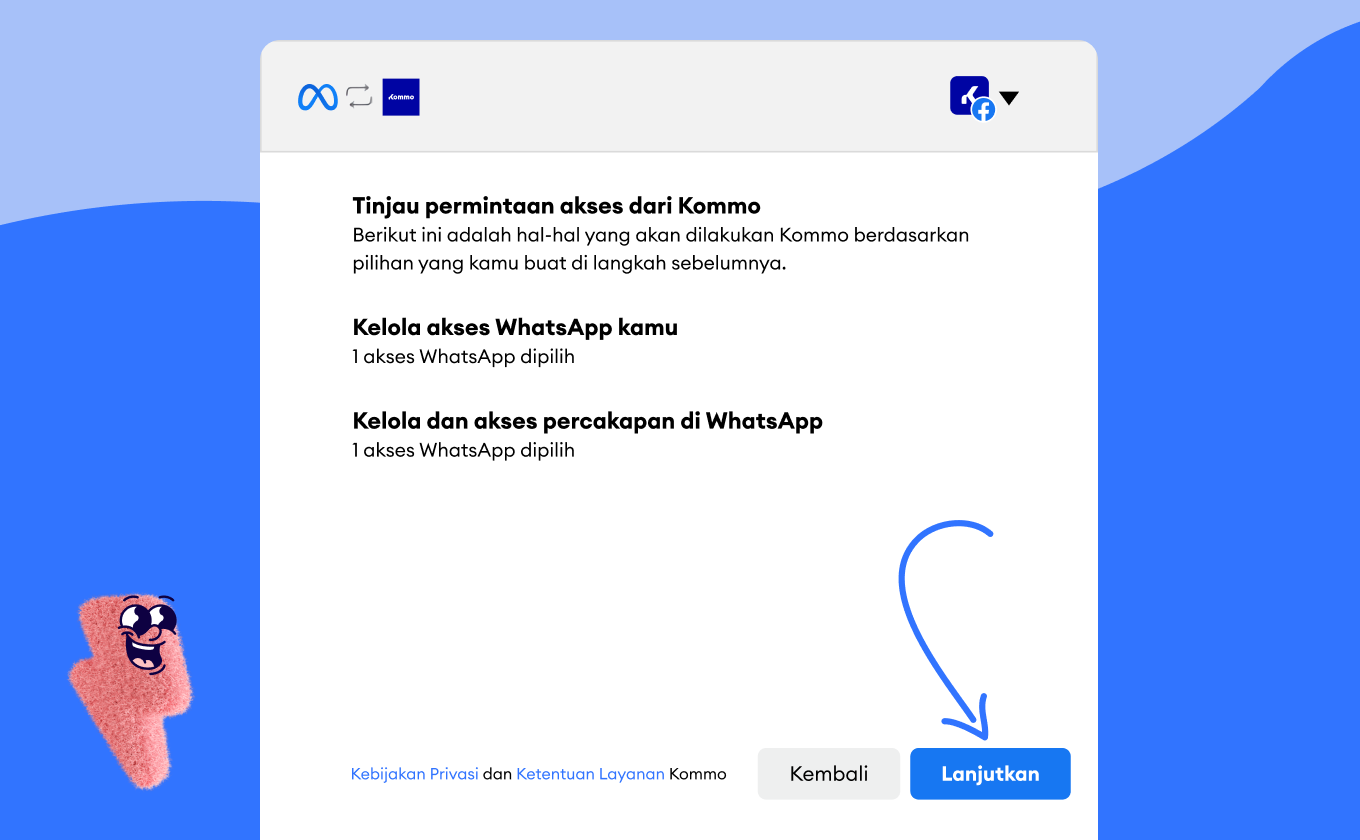 1. Masukkan kode verifikasi yang kamu terima dan klik Berikutnya. Tinjau permintaan akses dari Kommo dan klik Lanjutkan.