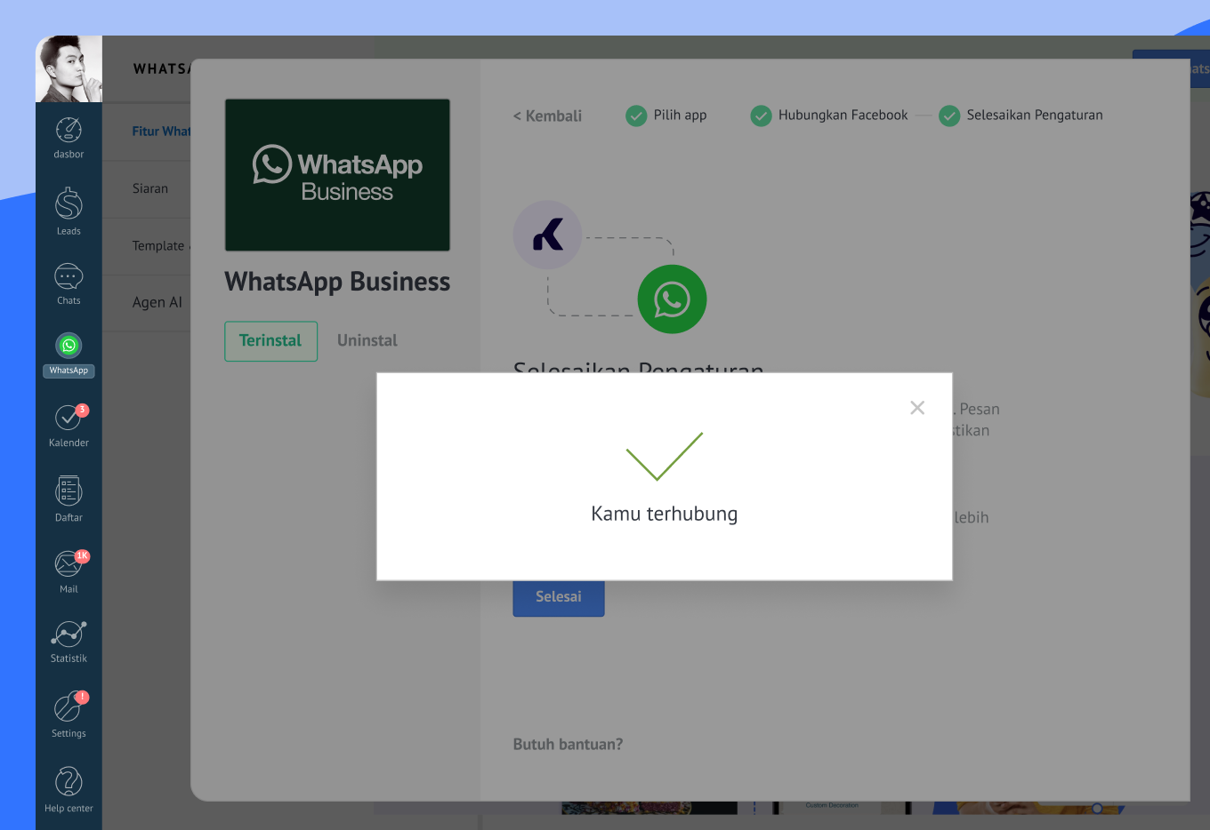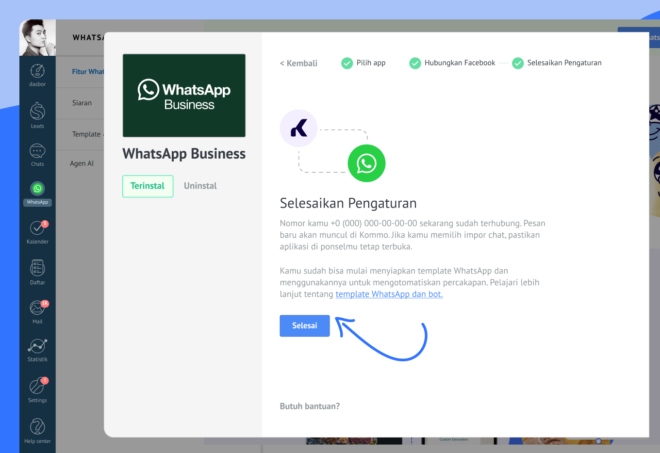 1. Kamu akan diarahkan kembali ke Kommo dan akan muncul jendela untuk menyelesaikan pengaturan. Klik Selesai.