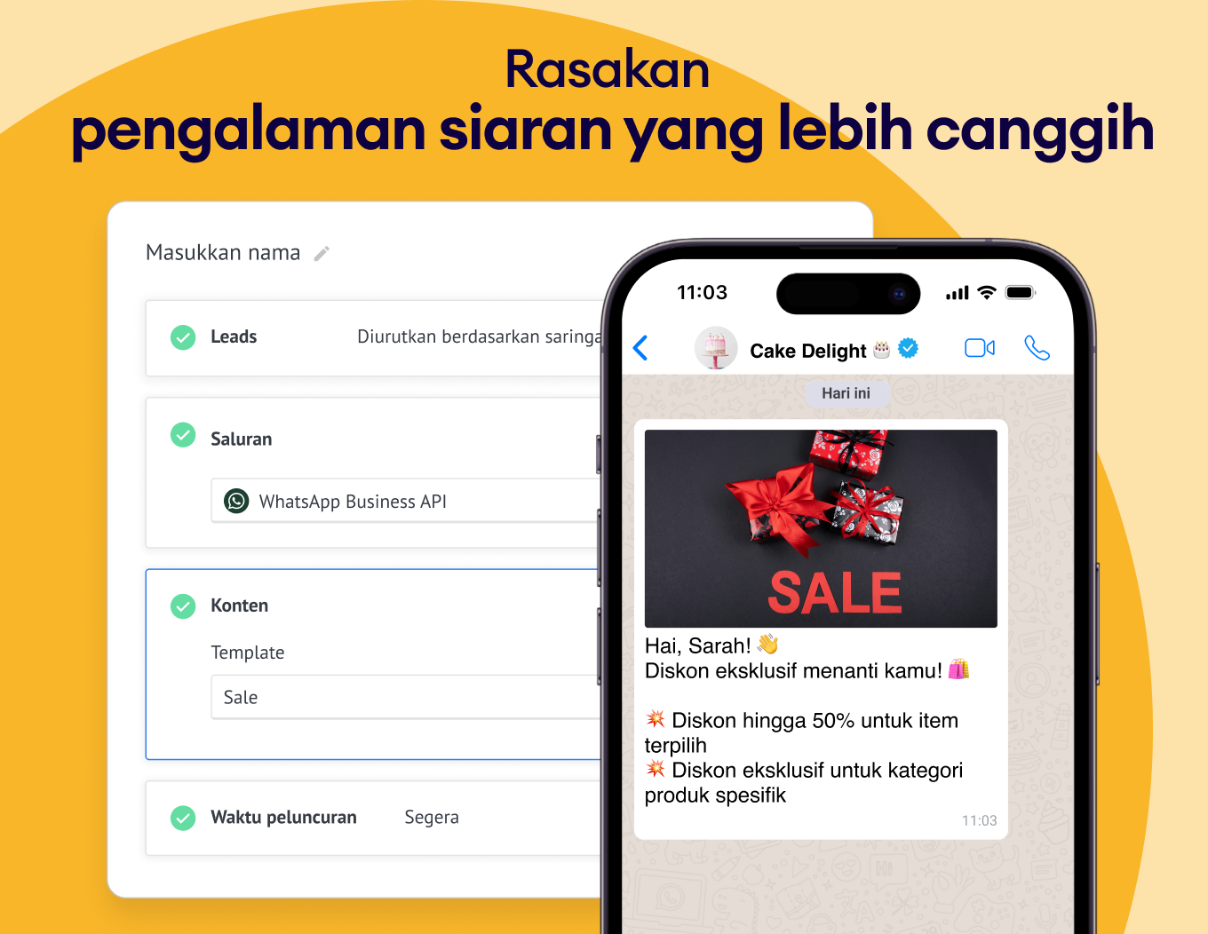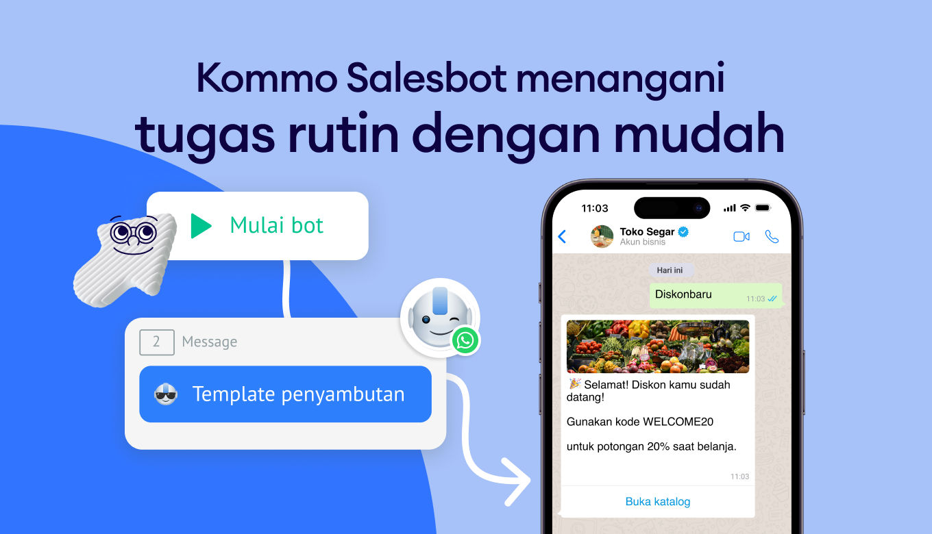 Capai lebih banyak dengan bantuan bot. Otomatiskan alur kerja dan kampanye komunikasi pelanggan, sehingga kamu bisa fokus pada tujuan yang paling penting.