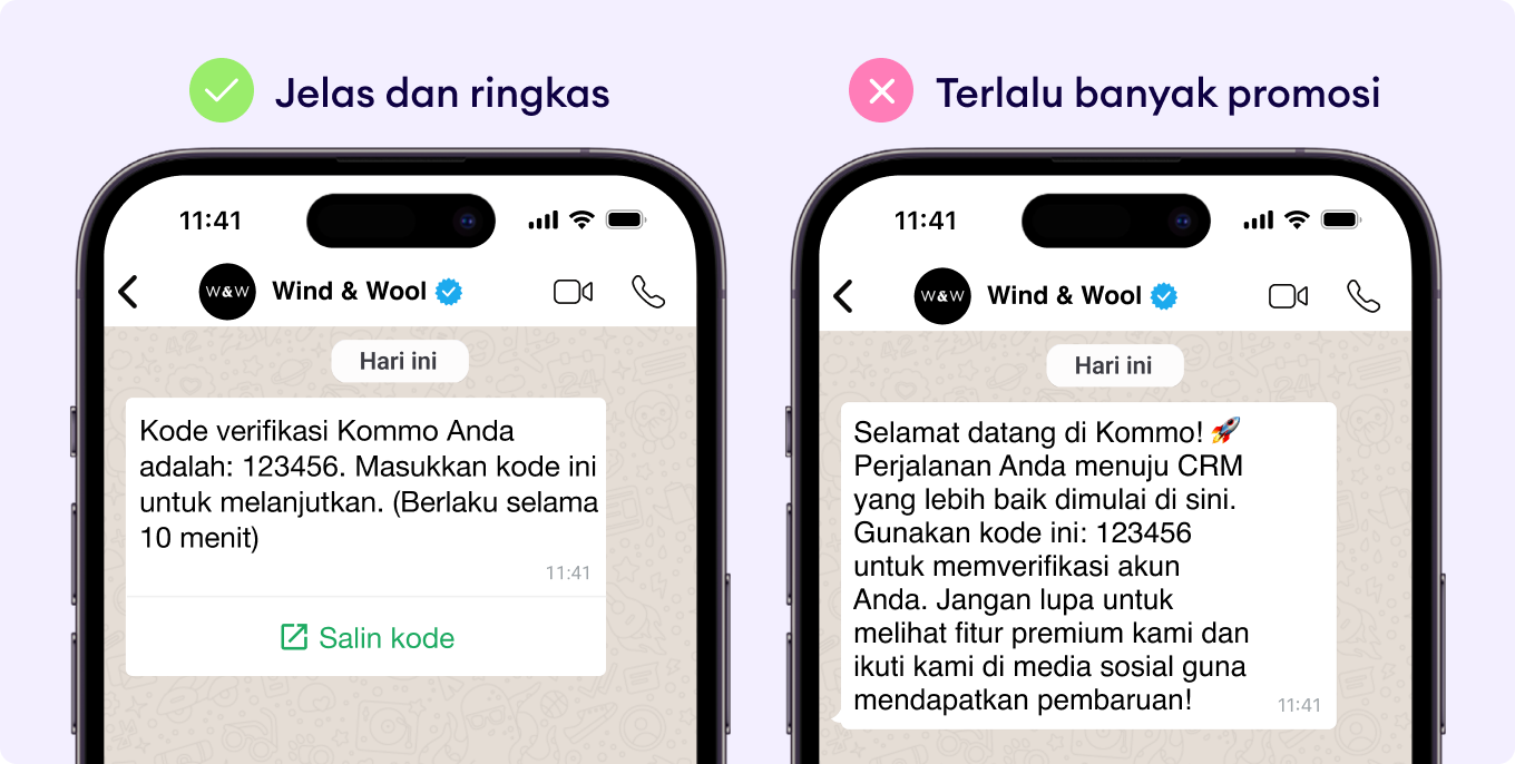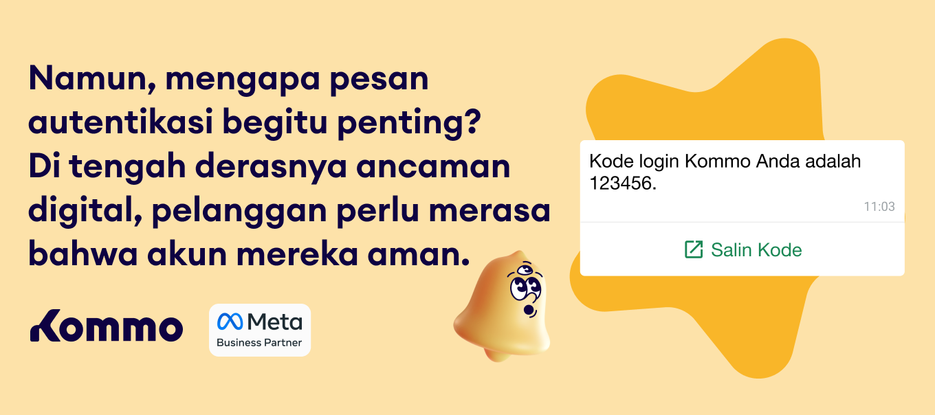 Konsistensi dan adopsi: Komunikasi brand yang konsisten dan profesional di setiap permintaan autentikasi akan mempercepat adopsi pesan autentikasi WhatsApp oleh pelanggan.