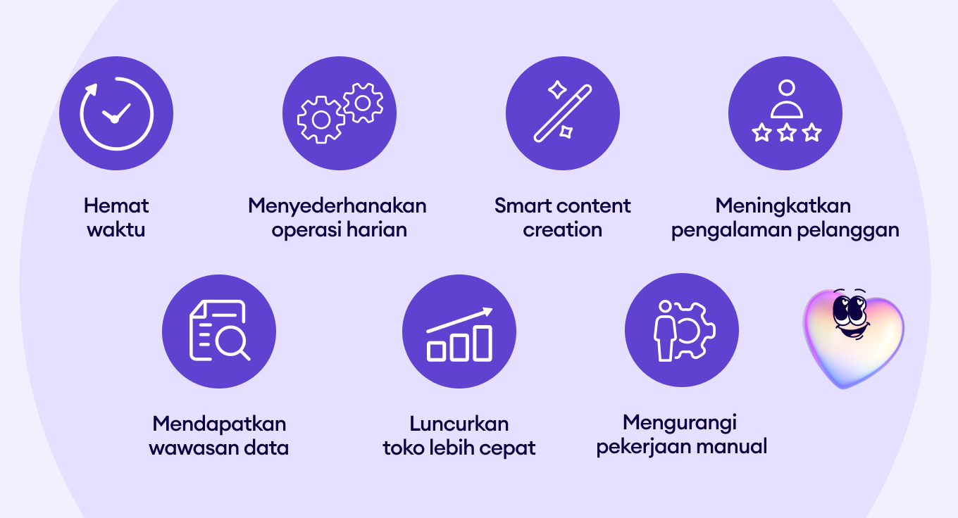 Shopify AI membantu seller menghemat waktu dan menyederhanakan tugas e-commerce melalui otomatisasi bawaan. Berikut beberapa manfaat utamanya: