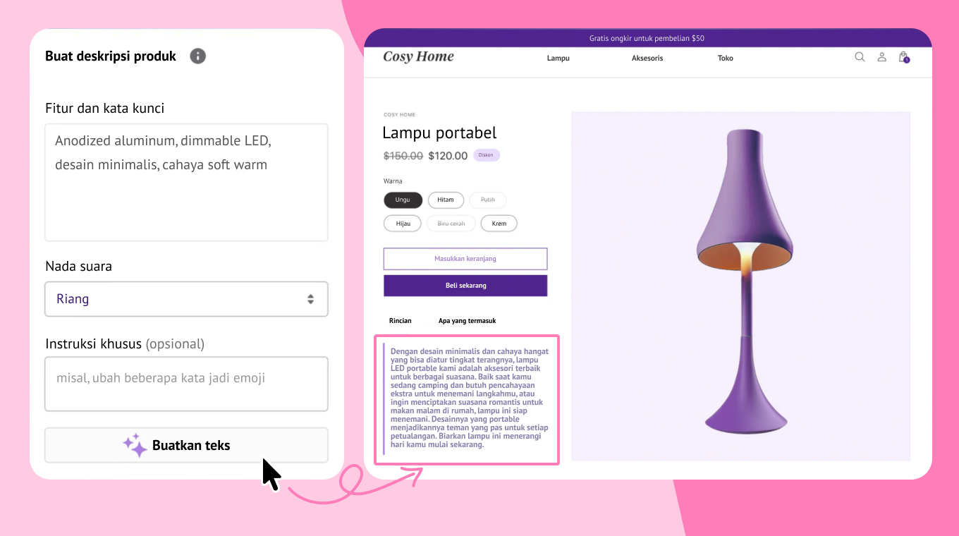 - Deskripsi produk yang dihasilkan AI menghemat waktu sekaligus meningkatkan SEO dan kejelasan produk, membantu pembeli menemukan dan memahami produk dengan lebih cepat.