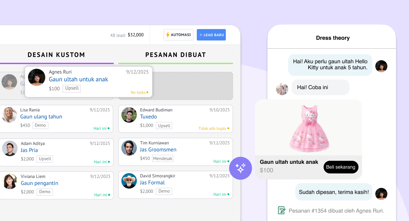 - CRM adalah tempat kamu menindaklanjuti segmentasi tersebut — mengelola chat WhatsApp, mengotomatisasi balasan komentar Instagram, menyinkronkan inquiry dari TikTok, mengatur task follow-up untuk tim, membangun riwayat pelanggan yang lengkap di luar pembelian, serta mencatat semua percakapan dalam satu timeline pelanggan yang terpadu.