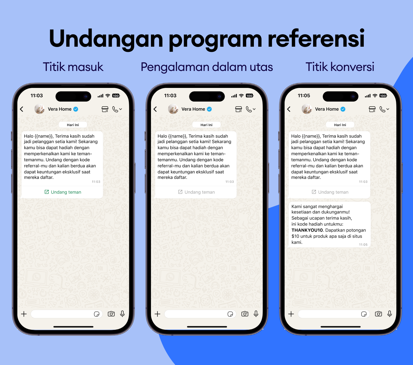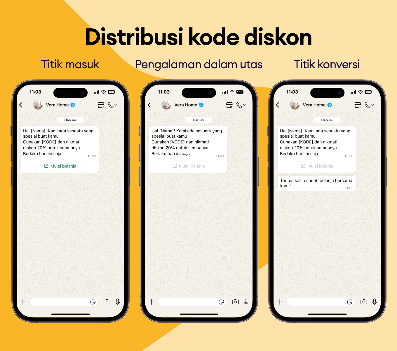 Bagikan kode promo dan diskon yang terasa personal dan benar-benar ingin digunakan pelanggan, langsung di chat WhatsApp mereka.
