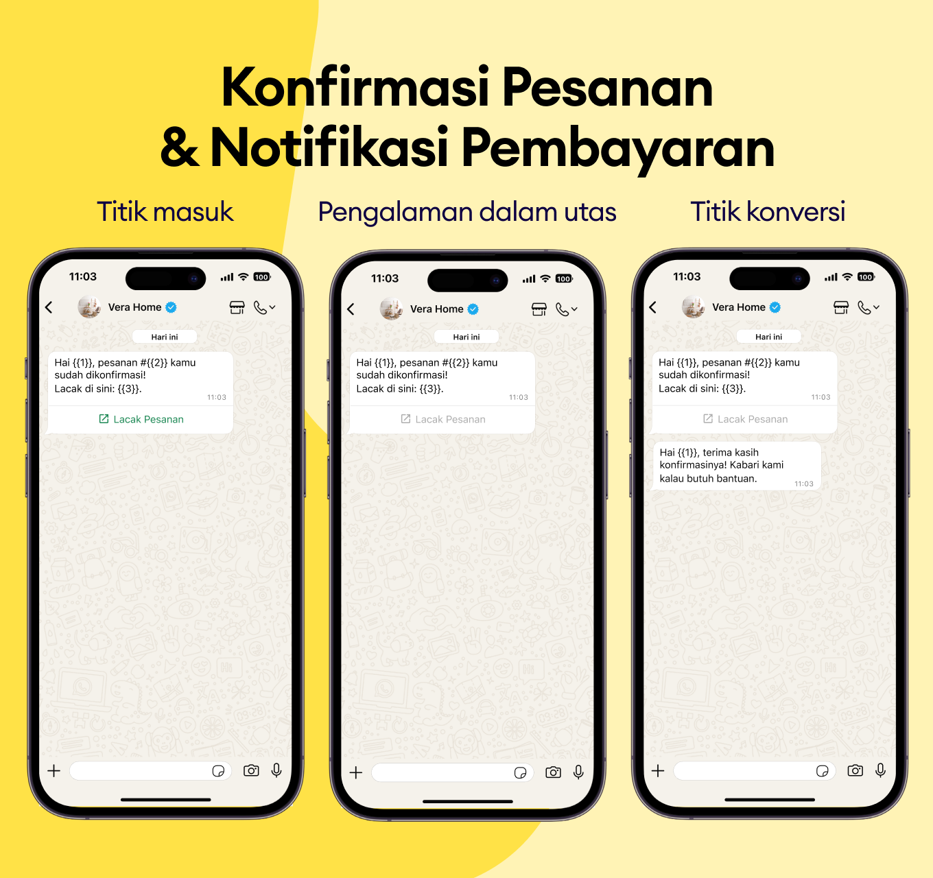 Jaga pelanggan kamu tetap update dengan mengirim konfirmasi instan berisi semua detail penting langsung ke WhatsApp.
