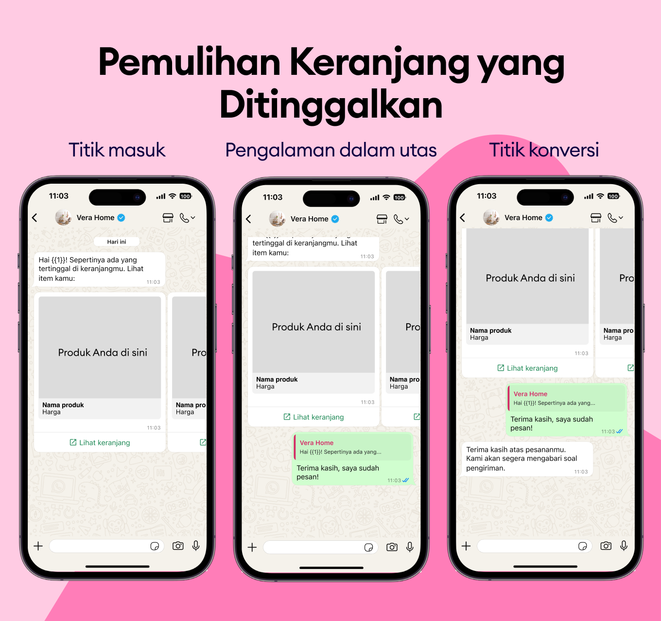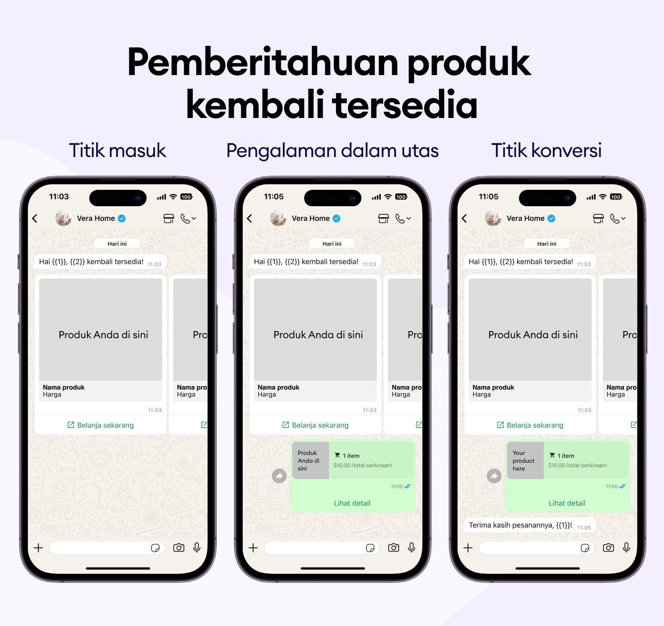 Kirim notifikasi sederhana melalui template WhatsApp saat produk favorit mereka kembali tersedia, supaya mereka bisa langsung membelinya sebelum habis lagi.