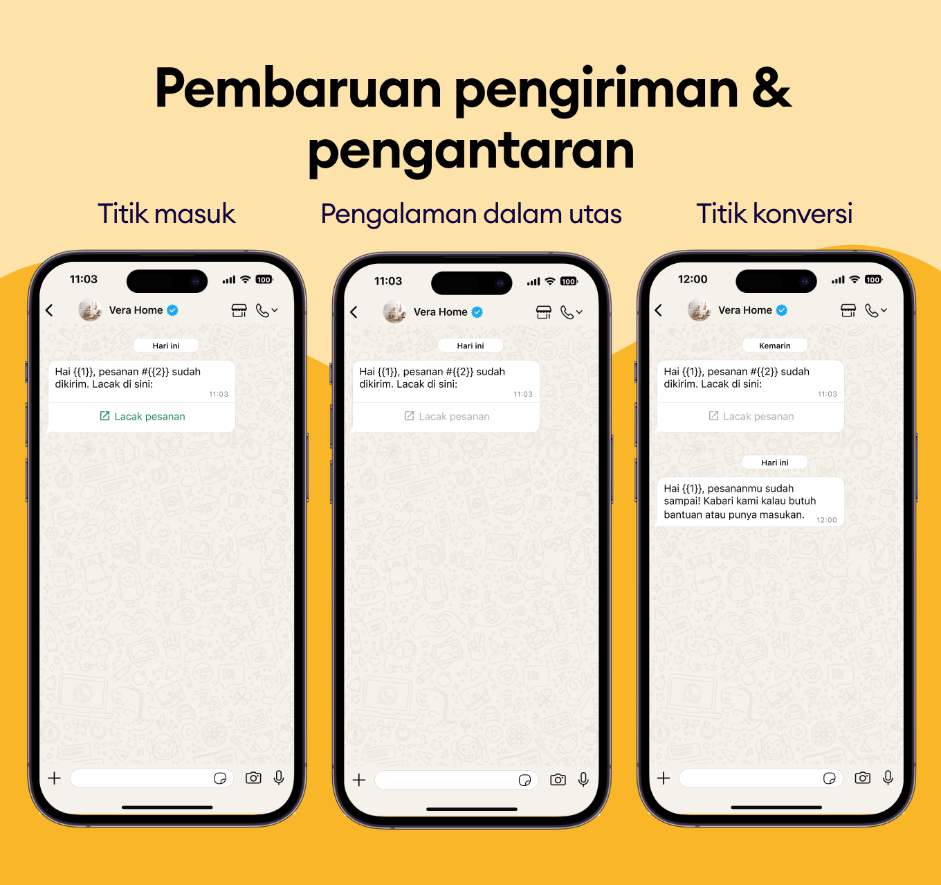 Cegah panggilan tim support sebelum terjadi dengan mengirim notifikasi pengiriman otomatis ke WhatsApp pelanggan, sehingga mereka bisa melacak setiap tahap pengiriman.