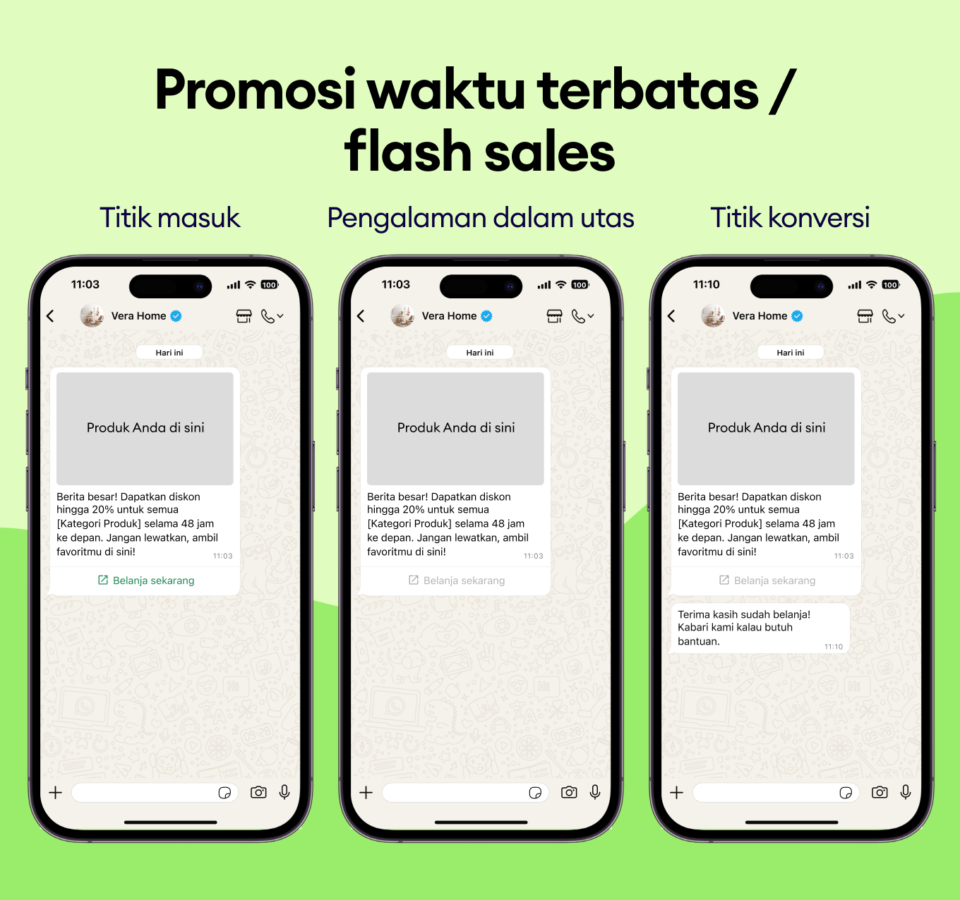 Kirim penawaran waktu terbatas dengan tombol “Belanja Sekarang” langsung ke chat pelanggan untuk menangkap pendapatan sebelum waktu habis.