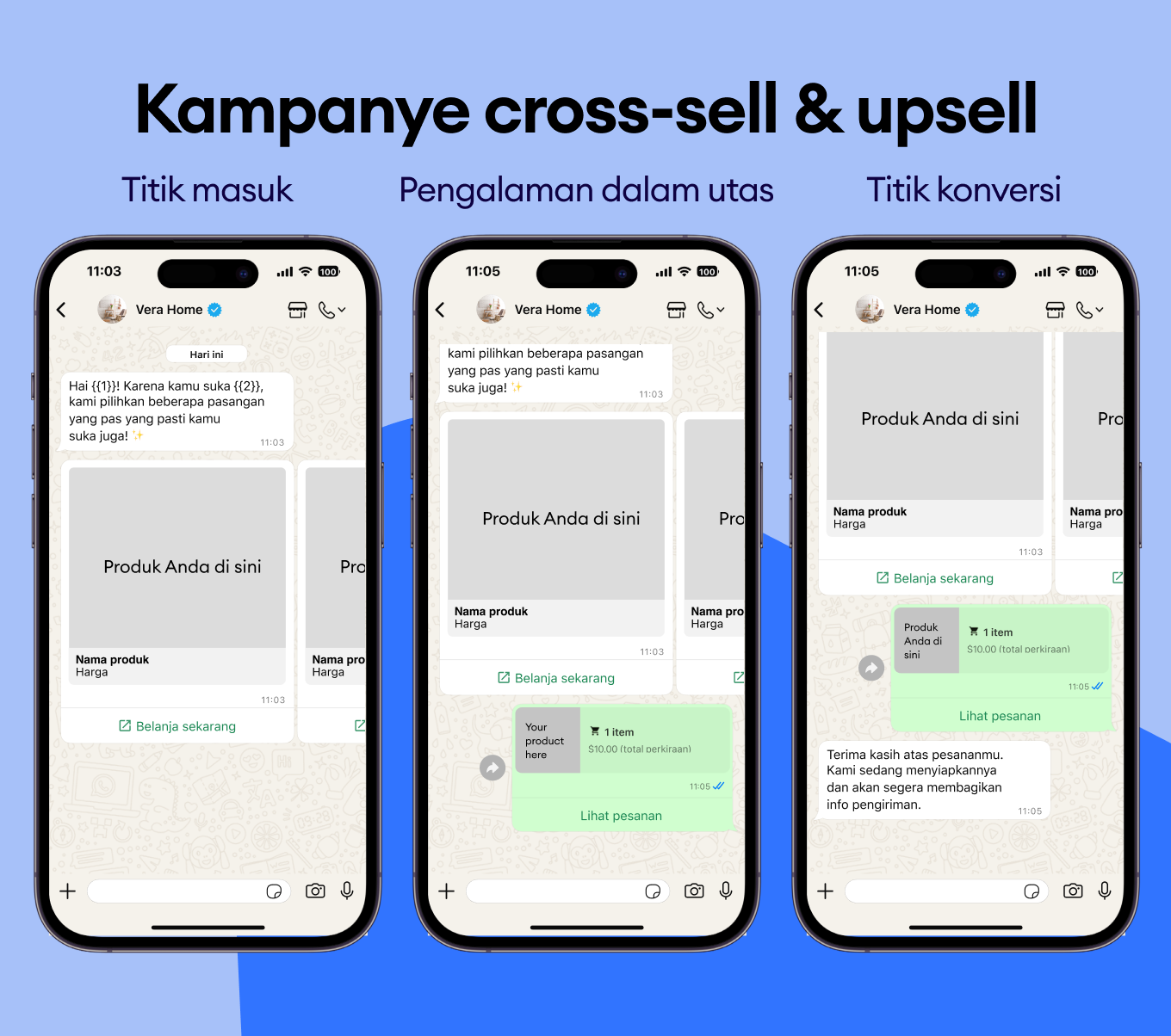 Rekomendasikan produk pelengkap dan sorot upgrade dengan template WhatsApp yang langsung meningkatkan pengalaman pelanggan.