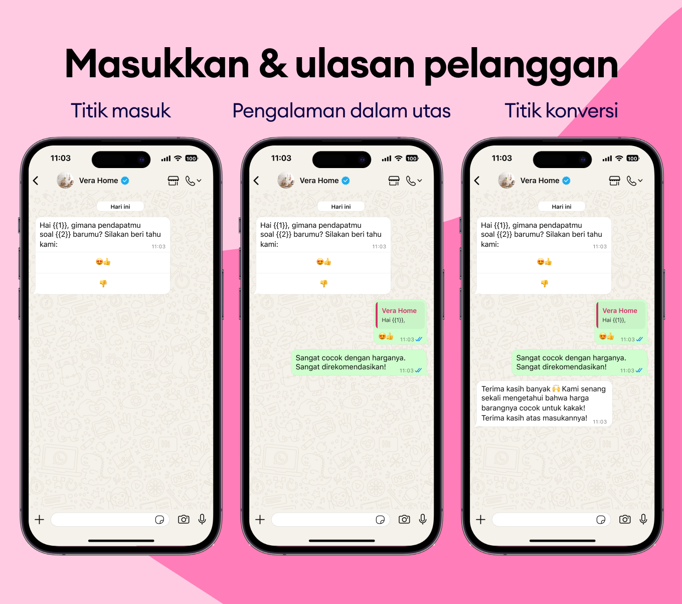 Dapatkan feedback pelanggan dengan pesan template WhatsApp satu klik yang lebih mungkin mereka kirimkan, dengan menghubungi mereka segera setelah pengiriman saat pengalaman produk masih fresh.
