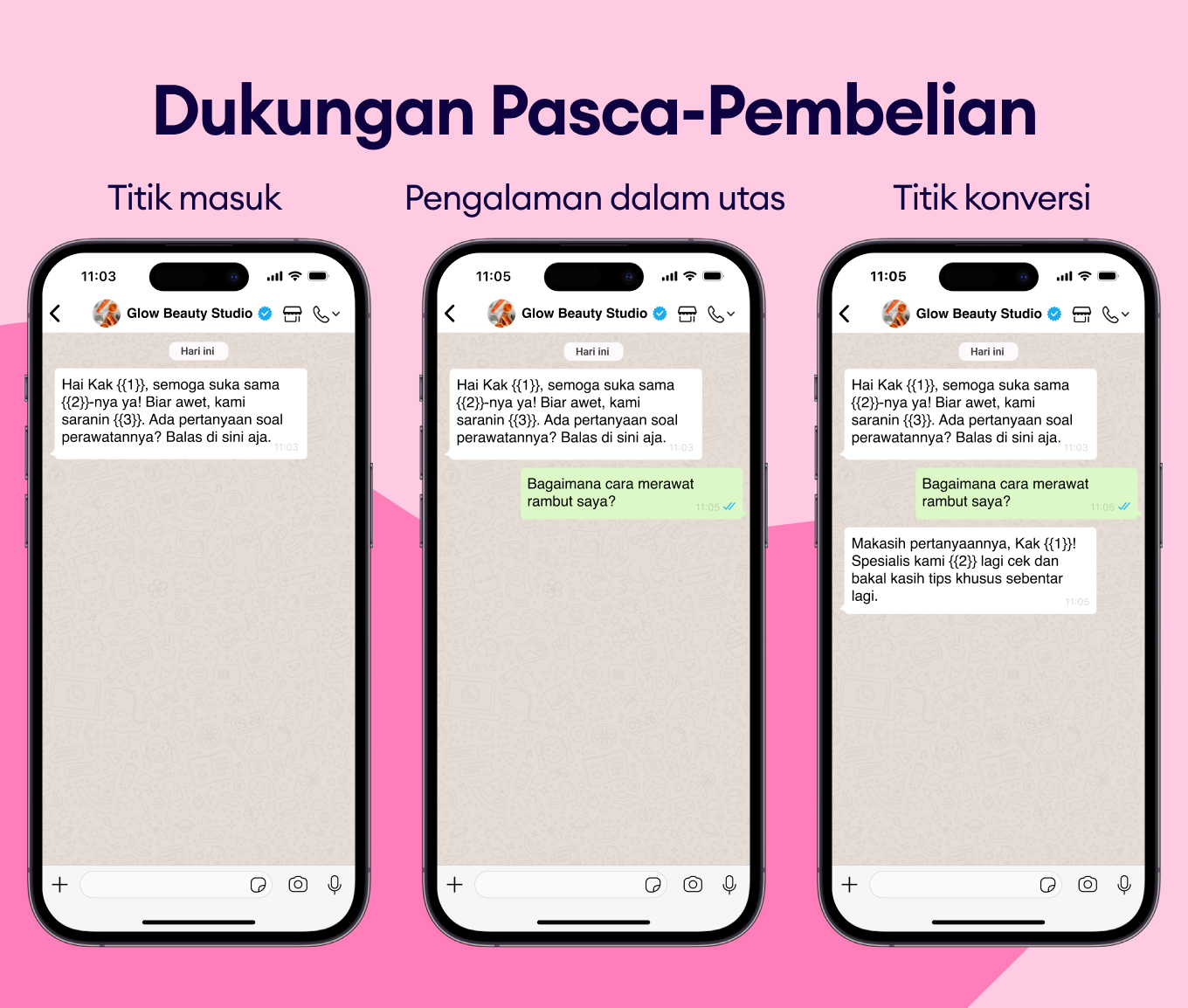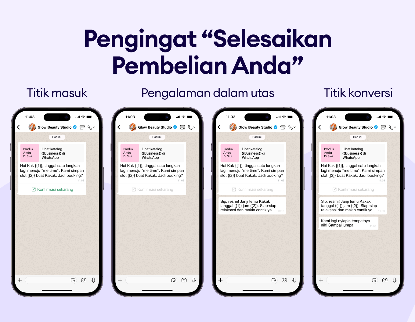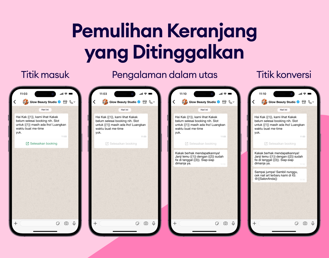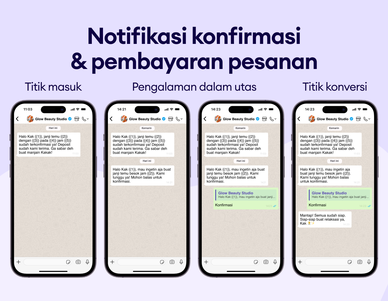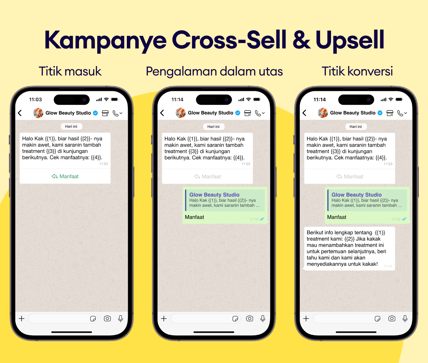 Gunakan template pesan WhatsApp untuk merekomendasikan add-on atau produk aftercare yang relevan demi pengalaman klien yang lebih bernilai.