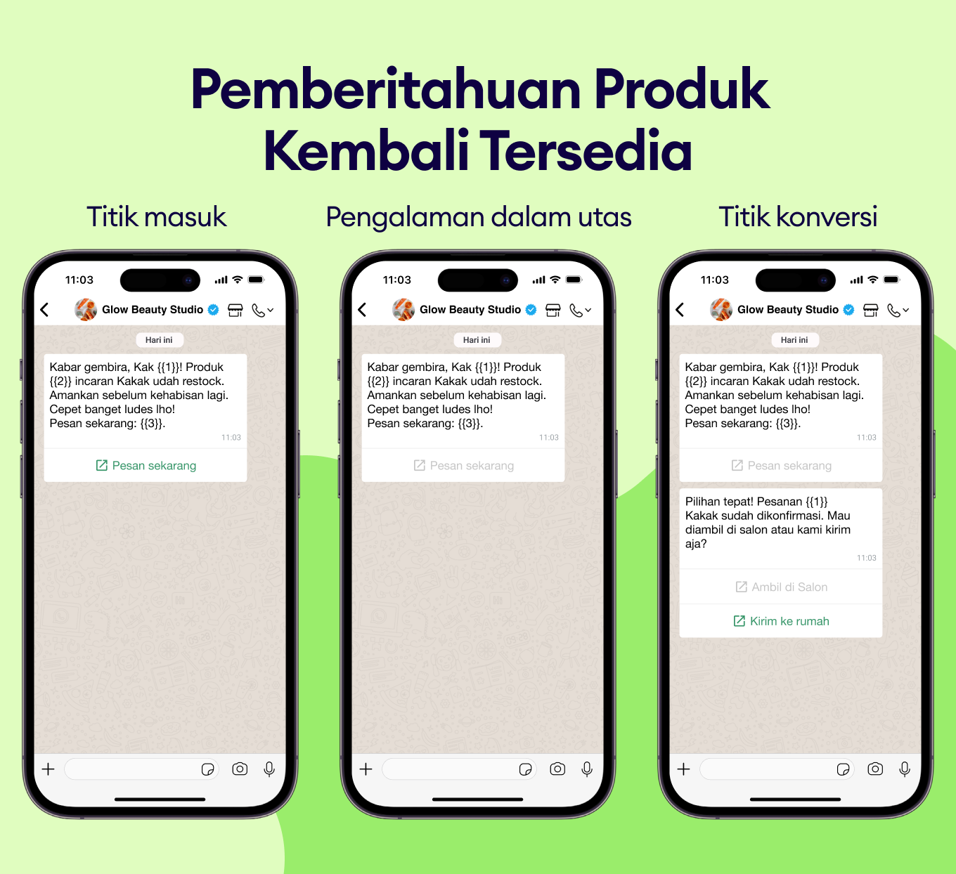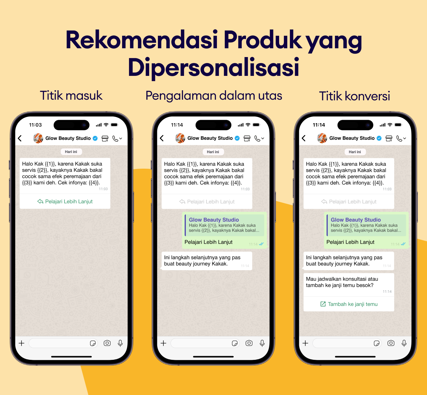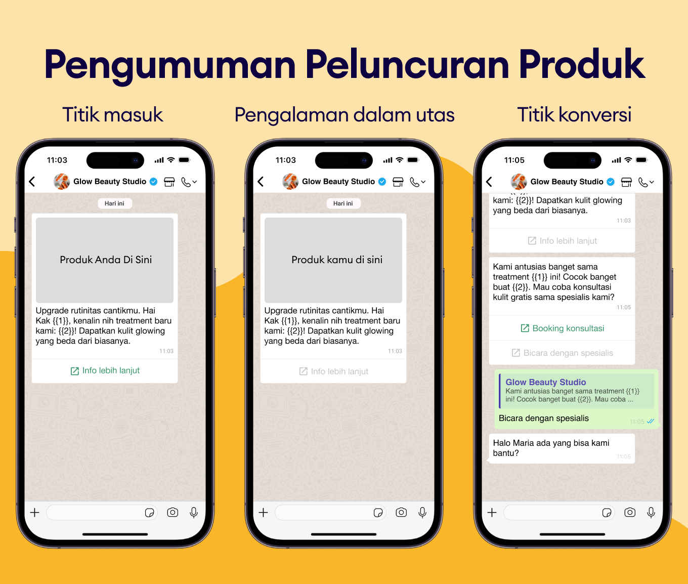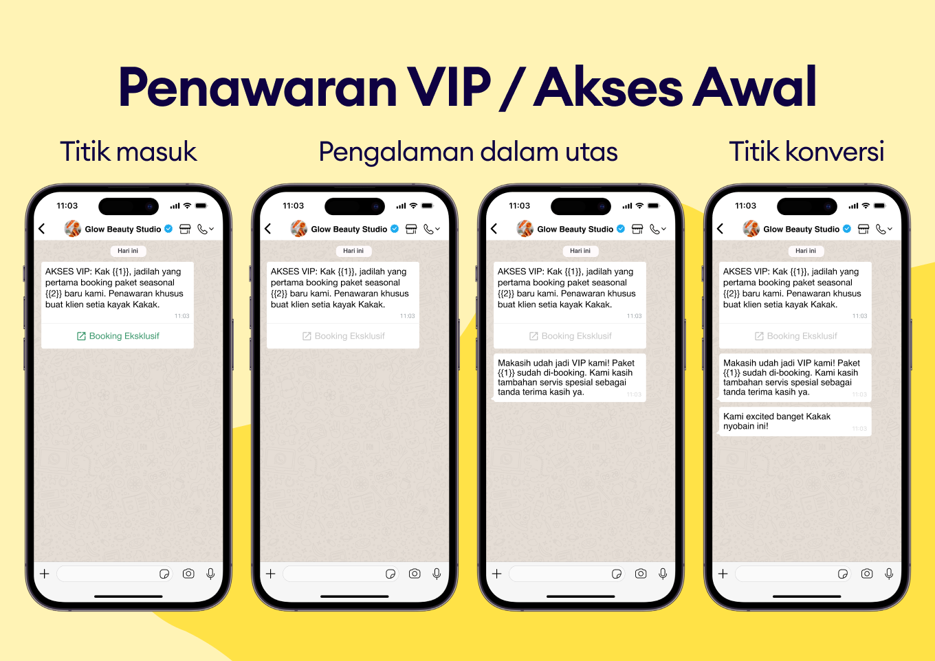 Berikan akses lebih awal ke treatment atau peluncuran produk baru melalui template pesan WhatsApp.
