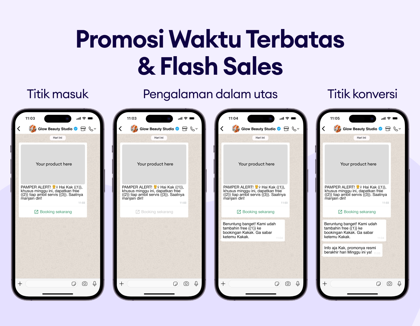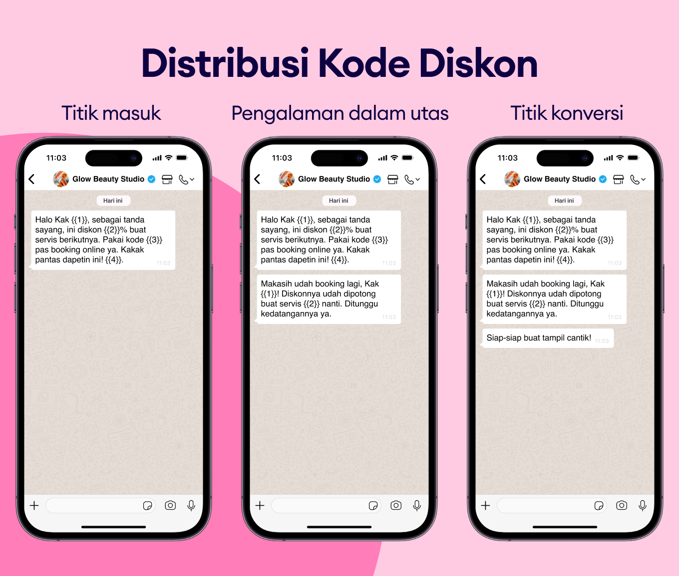 Bagikan kode promo melalui template pesan WhatsApp untuk mendorong booking dan pembelian secara instan.